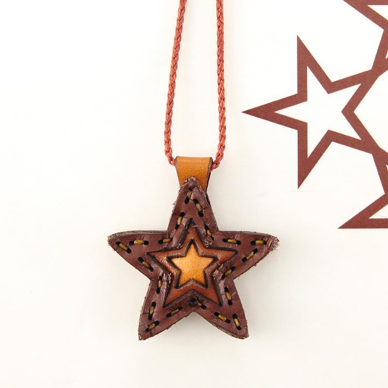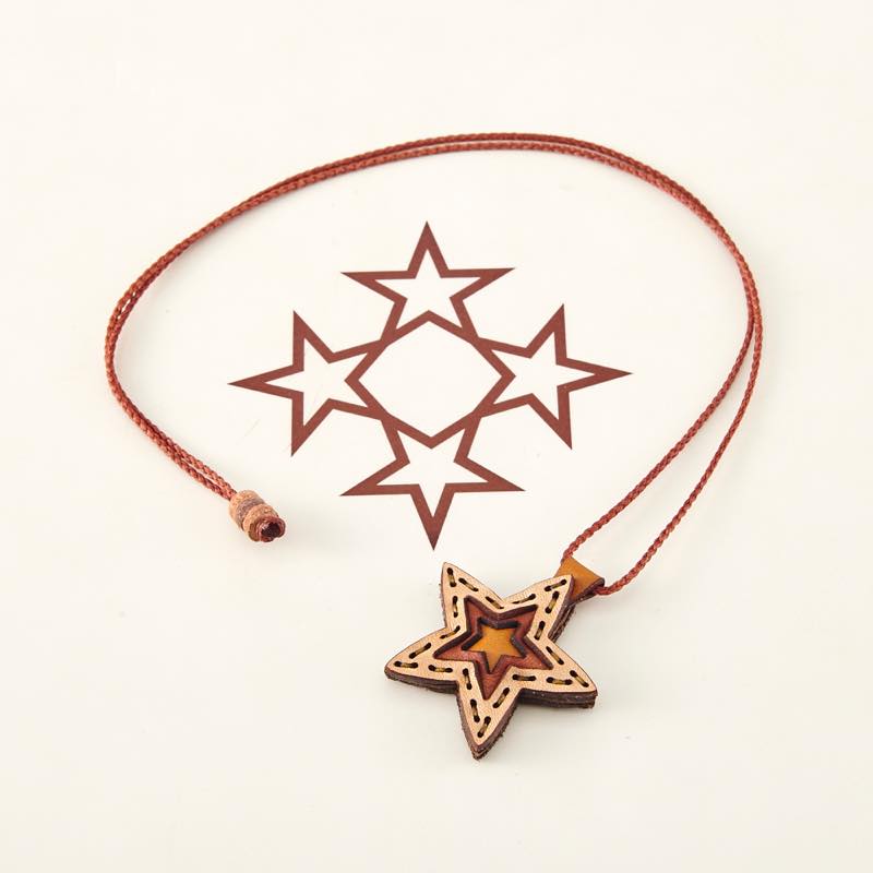 五芒星をデザインしたネックレスです。三枚の革を重ねた存在感のある仕上がりは、ファッションのアクセントに最適です。表裏それぞれ異なったカラーリングなので、リバーシブルでお楽しみ頂けます。紐部分のレザービーズで紐をお好みの長さに調整出来る仕様となっております。