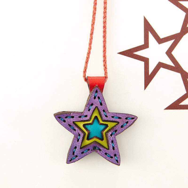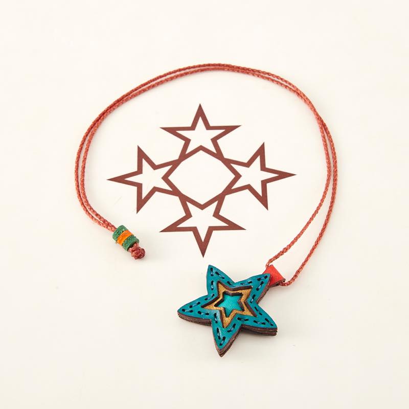五芒星をデザインしたネックレスです。三枚の革を重ねた存在感のある仕上がりは、ファッションのアクセントに最適です。表裏それぞれ異なったカラーリングなので、リバーシブルでお楽しみ頂けます。紐部分のレザービーズで紐をお好みの長さに調整出来る仕様となっております。