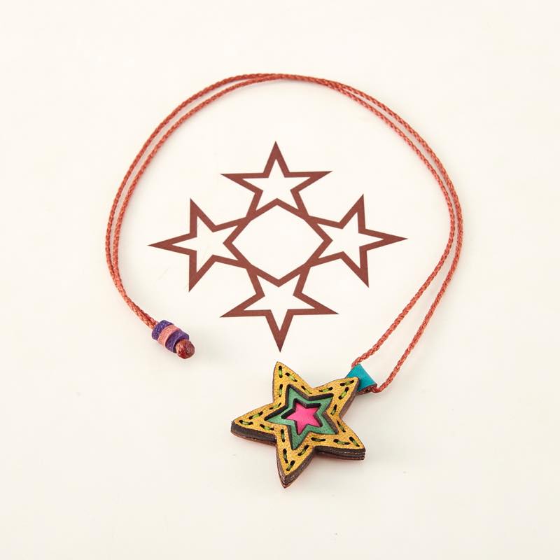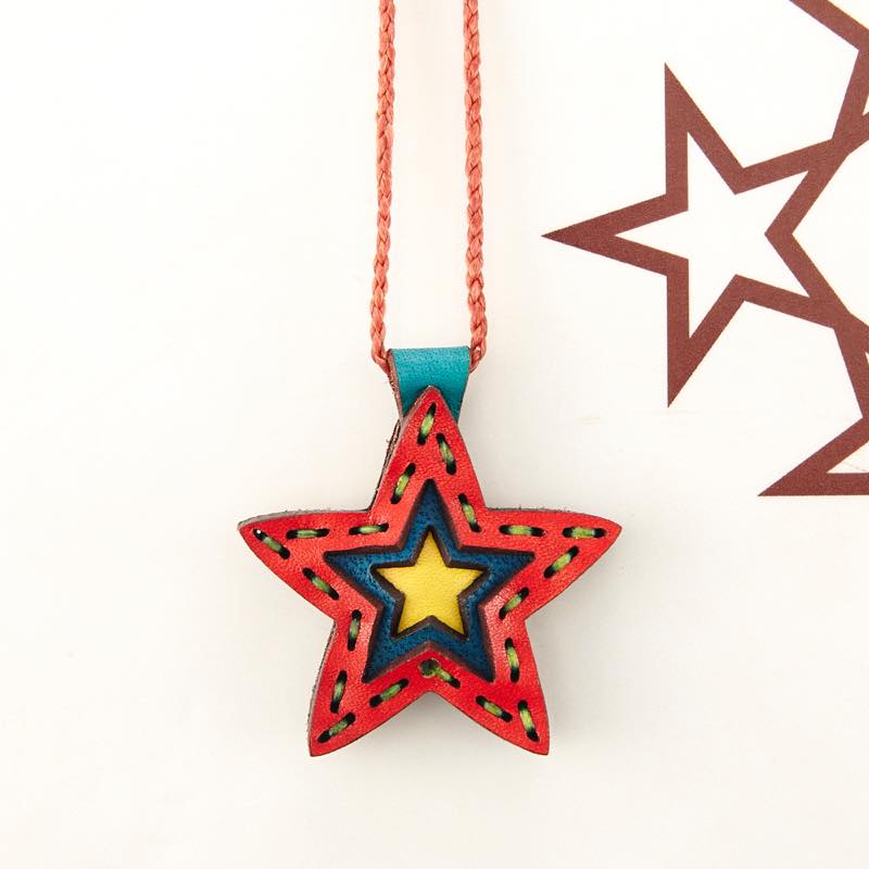 五芒星をデザインしたネックレスです。三枚の革を重ねた存在感のある仕上がりは、ファッションのアクセントに最適です。表裏それぞれ異なったカラーリングなので、リバーシブルでお楽しみ頂けます。紐部分のレザービーズで紐をお好みの長さに調整出来る仕様となっております。