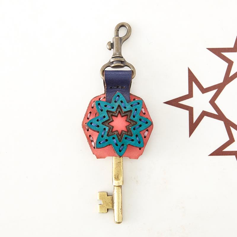 八芒星がデザインされたキーキャップです。三枚の革を重ねて表現した八芒星が印象的な仕上がりとなりました。便利なナスカン付きなので、ベルトループやキーホルダーに付けてお使い頂けます。