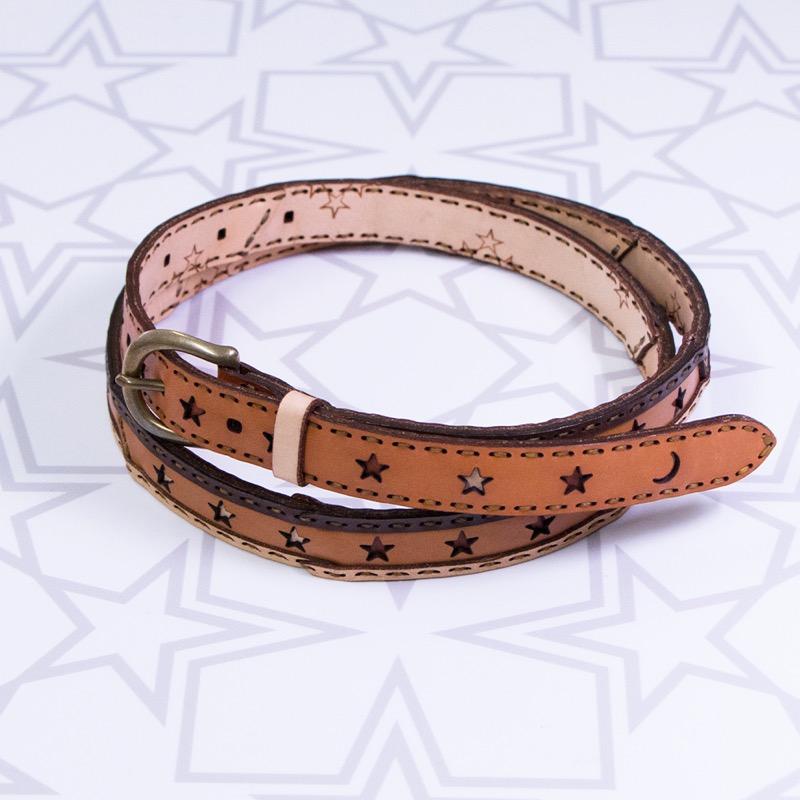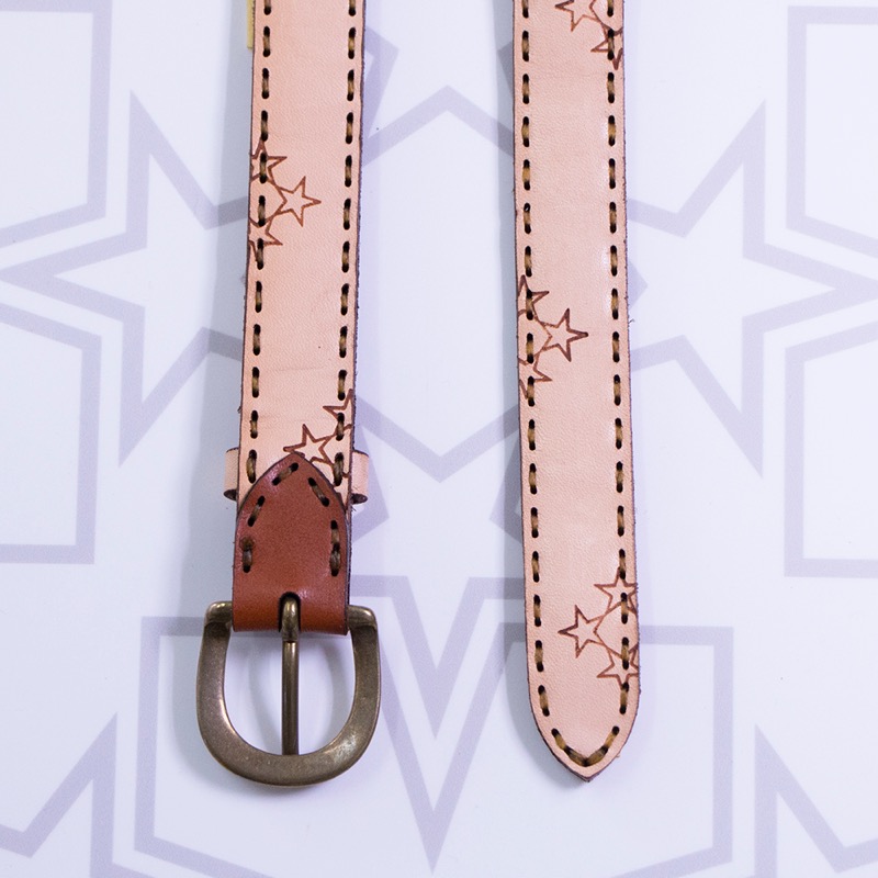 カラフルな五芒星が目を惹くベルトは、すっきりとした細幅タイプ。たくさんのカラーを組み合わせた、他にはないオジャガデザインらしい仕上がりとなりました。裏側にはオジャガスターの焼き印を施し、細部までこだわったデザインに。SとMの2サイズ展開となります。