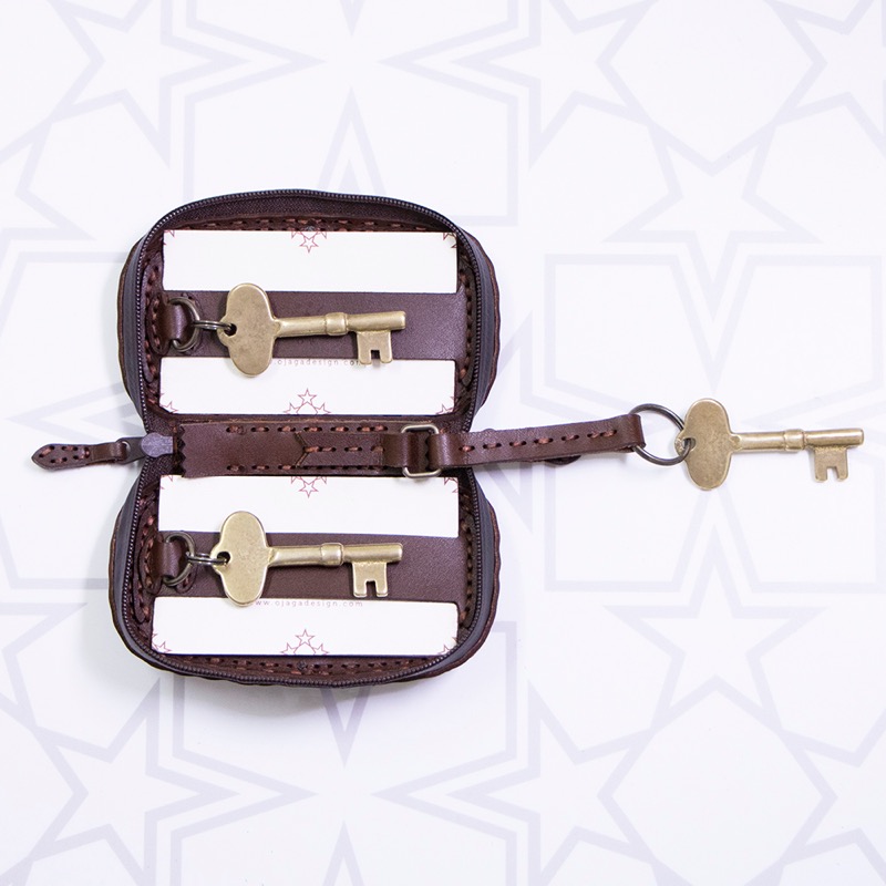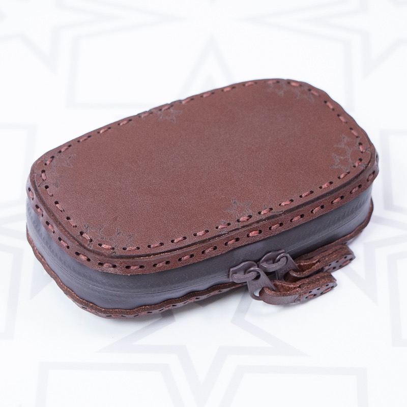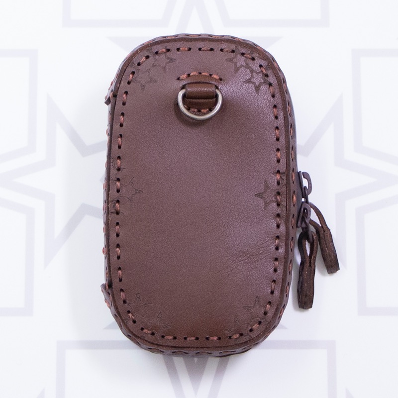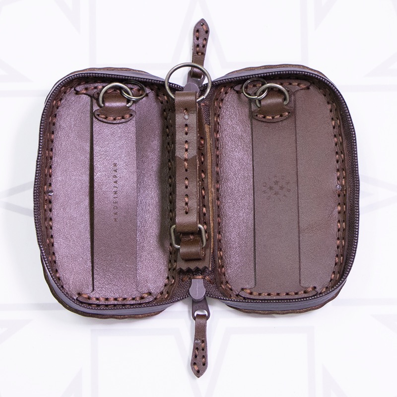 オジャガスターの焼き印が入ったシンプルなシリーズにキーケースが登場。機能性を重視した楕円形のフォルムに仕上がりました。ダブルジップのラウンドファスナーと厚めのマチを付けることで中身を大切に保護するだけでなく、たくさんの鍵はもちろん、車用のスマートキーや厚みのあるノンタッチキーも収納が可能。よく使う鍵はレザーコード付きの二重リングに着けることで、鍵の開閉もスマートに。内側にはカードが収納できるようになっているので、駐車券やICカード、カードキーなどを入れられます。背面のDカンにはキーホルダーを着けたり、ベルトループと繋いだりと、カスタムしてお使い下さい。