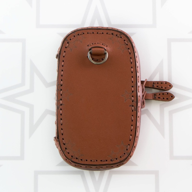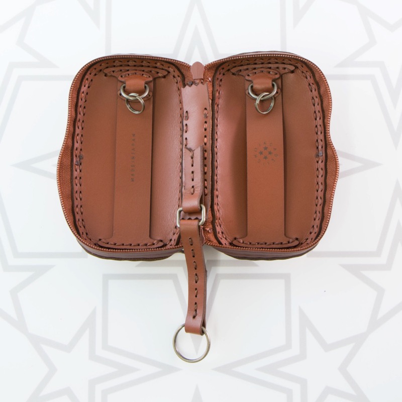 オジャガスターの焼き印が入ったシンプルなシリーズにキーケースが登場。機能性を重視した楕円形のフォルムに仕上がりました。ダブルジップのラウンドファスナーと厚めのマチを付けることで中身を大切に保護するだけでなく、たくさんの鍵はもちろん、車用のスマートキーや厚みのあるノンタッチキーも収納が可能。よく使う鍵はレザーコード付きの二重リングに着けることで、鍵の開閉もスマートに。内側にはカードが収納できるようになっているので、駐車券やICカード、カードキーなどを入れられます。背面のDカンにはキーホルダーを着けたり、ベルトループと繋いだりと、カスタムしてお使い下さい。