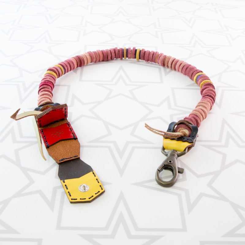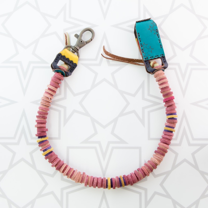 両サイドにナスカンとスナップボタンがついたウォレットループです。ループ部分は丸いレザービーズを繋ぎ、オジャガデザインらしい仕上がりに。カラフルな色使いで、ファッションのアクセントとしてもおすすめです。