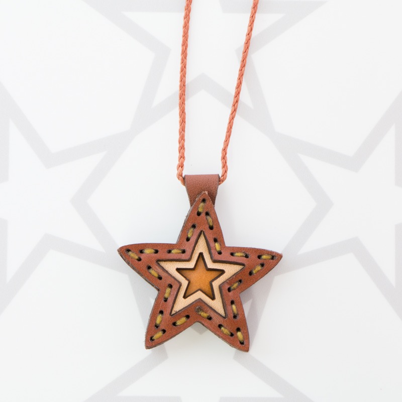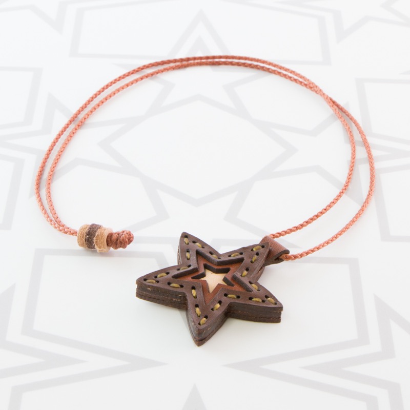 五芒星をデザインしたネックレスです。三枚の革を重ねた存在感のある仕上がりは、ファッションのアクセントに最適です。表裏それぞれ異なったカラーリングなので、リバーシブルでお楽しみ頂けます。紐部分のレザービーズで紐をお好みの長さに調整出来る仕様となっております。