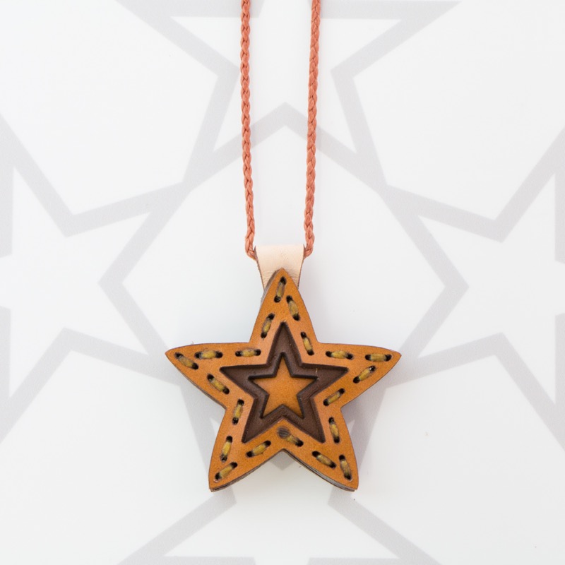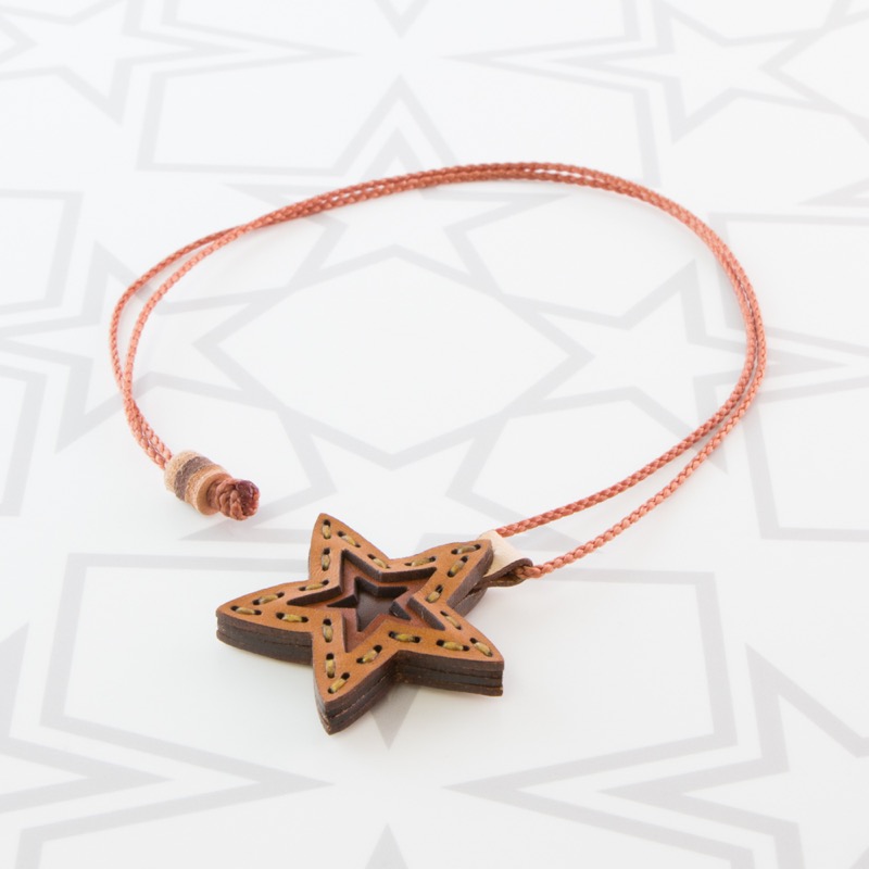 五芒星をデザインしたネックレスです。三枚の革を重ねた存在感のある仕上がりは、ファッションのアクセントに最適です。表裏それぞれ異なったカラーリングなので、リバーシブルでお楽しみ頂けます。紐部分のレザービーズで紐をお好みの長さに調整出来る仕様となっております。