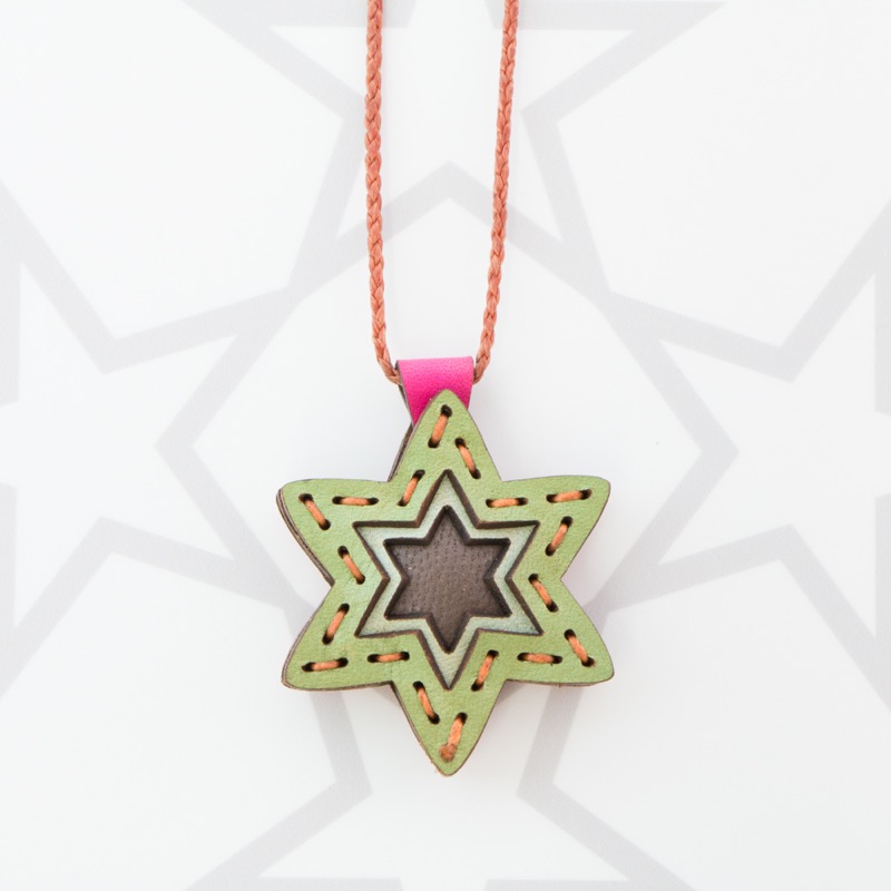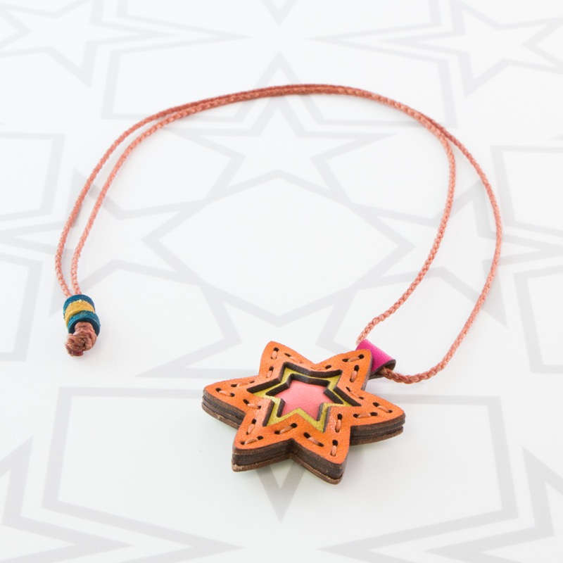 六芒星をデザインしたネックレスです。三枚の革を重ねた存在感のある仕上がりは、ファッションのアクセントに最適です。表裏それぞれ異なったカラーリングなので、リバーシブルでお楽しみ頂けます。紐部分のレザービーズで紐をお好みの長さに調整出来る仕様となっております。