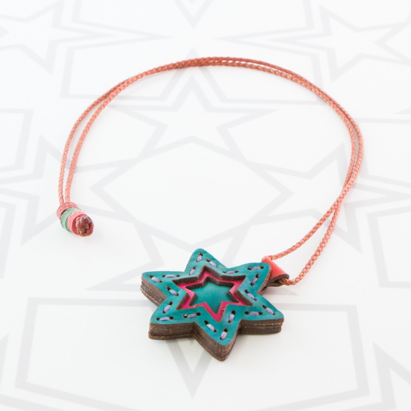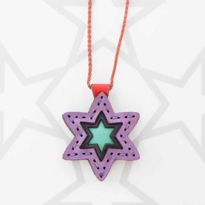 六芒星をデザインしたネックレスです。三枚の革を重ねた存在感のある仕上がりは、ファッションのアクセントに最適です。表裏それぞれ異なったカラーリングなので、リバーシブルでお楽しみ頂けます。紐部分のレザービーズで紐をお好みの長さに調整出来る仕様となっております。
