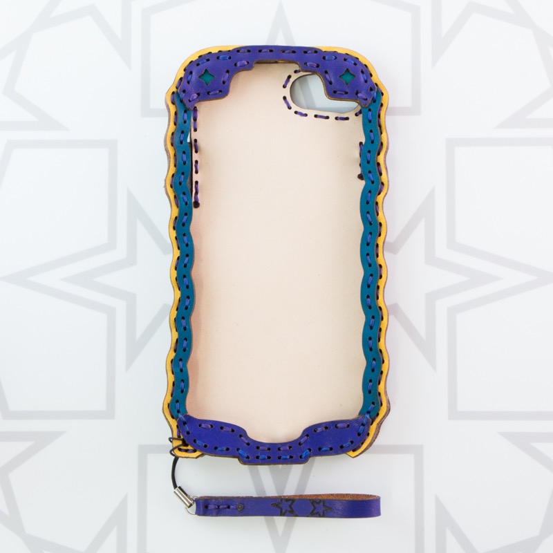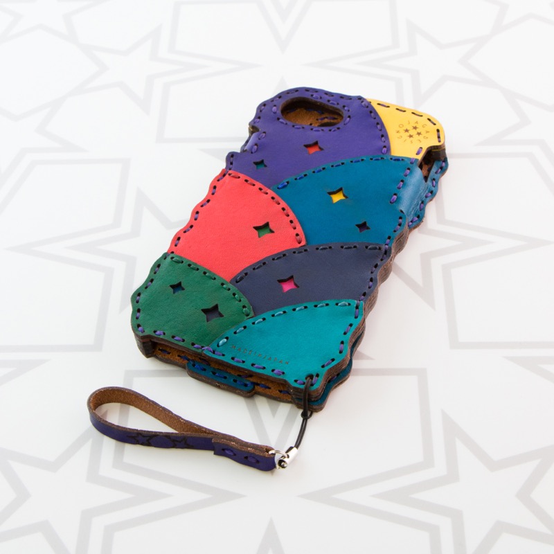 パッチワークデザインのiPhone6/7/8ケースです。幾重にも折り重なるパッチワークにキラキラと輝く四つ星のくり抜きをランダムに配置し、たくさんの色を楽しめるデザインになりました。iPhone本体をしっかりと覆うことが出来、側面にもレザーを使用することで保護性を高め、ウェーブ状のカットを施すことで持ちやすさも重視。ホームボタン部分は押しやすいよう広めの作りになっております。