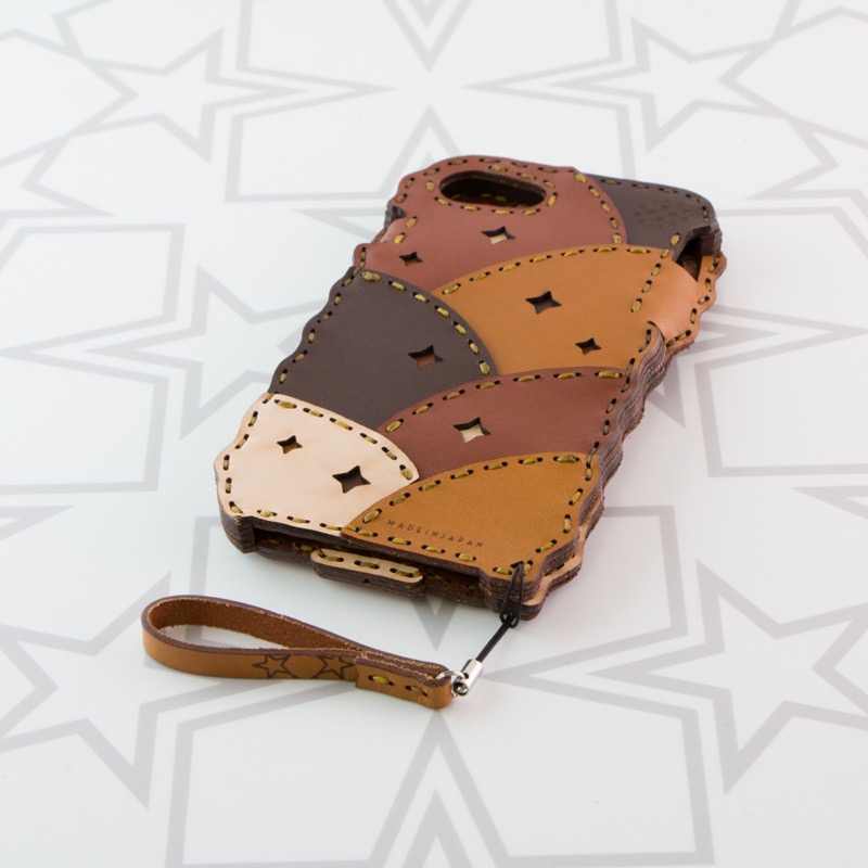 パッチワークデザインのiPhone6/7/8ケースです。幾重にも折り重なるパッチワークにキラキラと輝く四つ星のくり抜きをランダムに配置し、たくさんの色を楽しめるデザインになりました。iPhone本体をしっかりと覆うことが出来、側面にもレザーを使用することで保護性を高め、ウェーブ状のカットを施すことで持ちやすさも重視。ホームボタン部分は押しやすいよう広めの作りになっております。