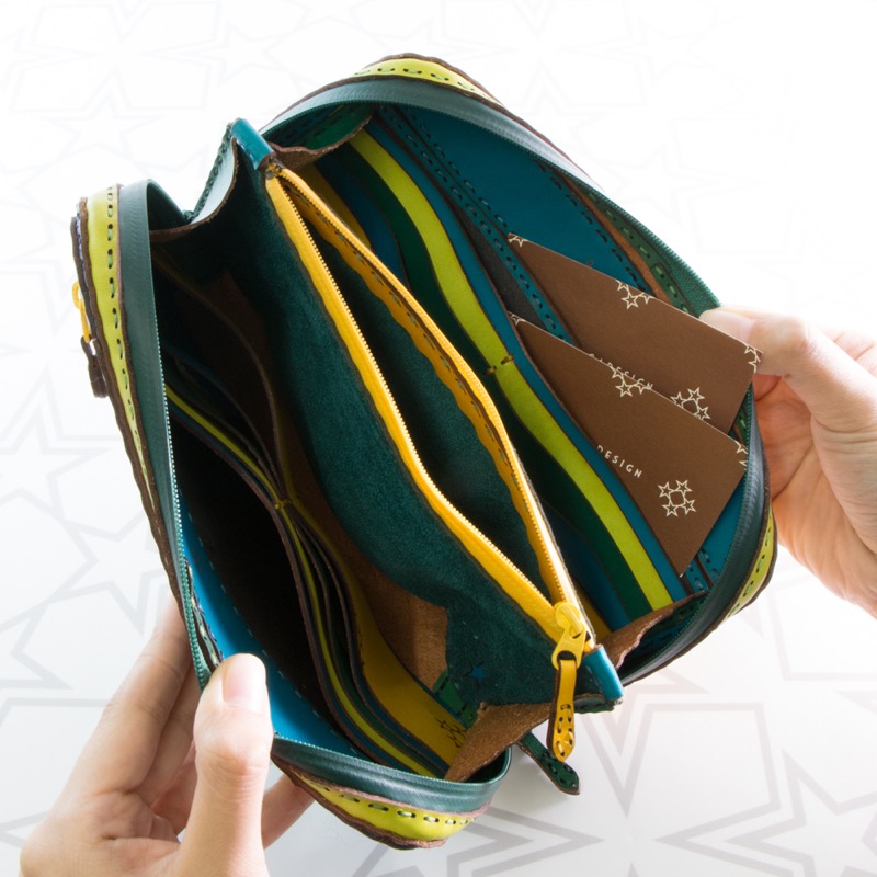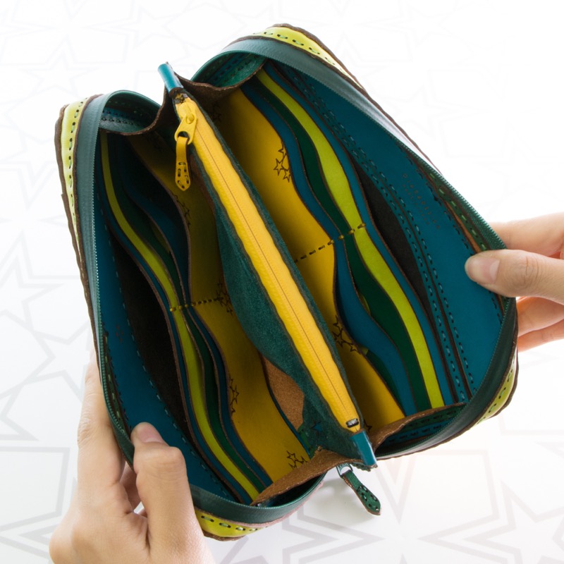 大きく開くダブルジップで中が見やすく、カードポケットが16箇所、ポケットが3箇所、コインケースはたっぷり入るジップタイプ、表にもジップのポケットが付いて収納力抜群の仕上がりになりました。