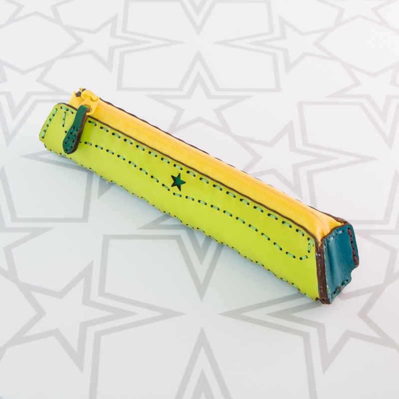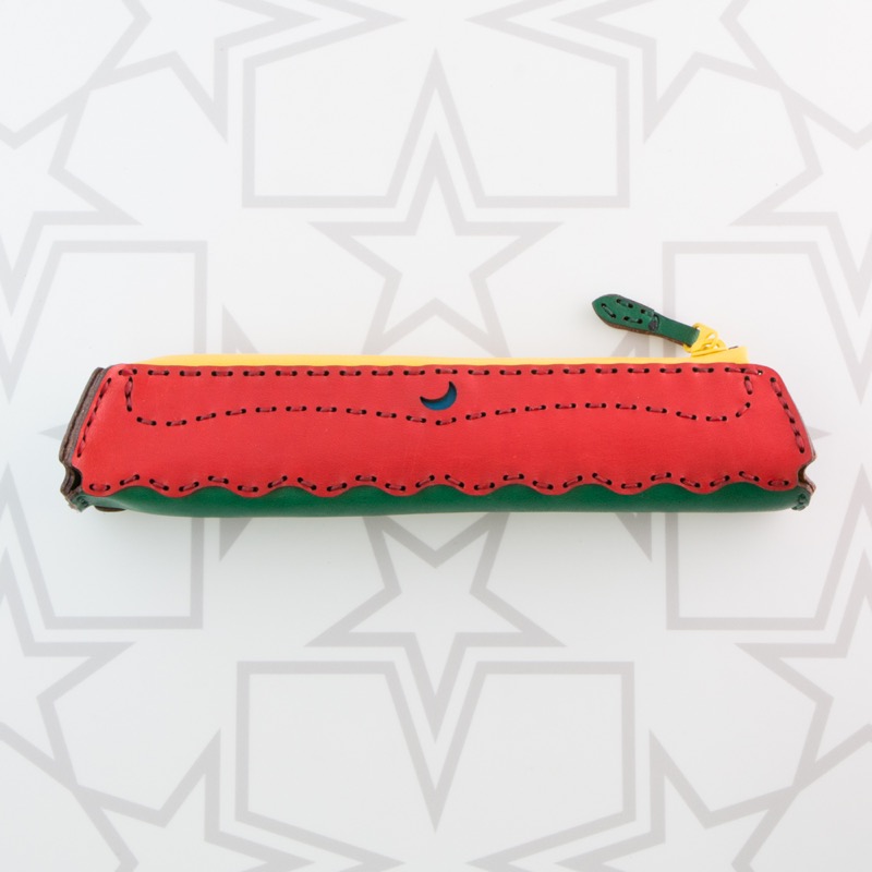 ジップタイプのペンケースがです。バッグの中で邪魔にならないコンパクトなサイズで、数本持ち歩きたい方にぴったりのスッキリとしたデザインになりました。ボールペンが約5本入り、大きく開くジップタイプなので中も見やすい作りとなっております。小さな月星と波型カットでオジャガデザインらしい仕上がりです。