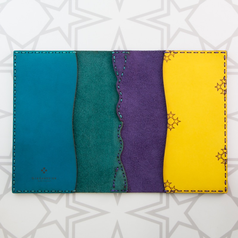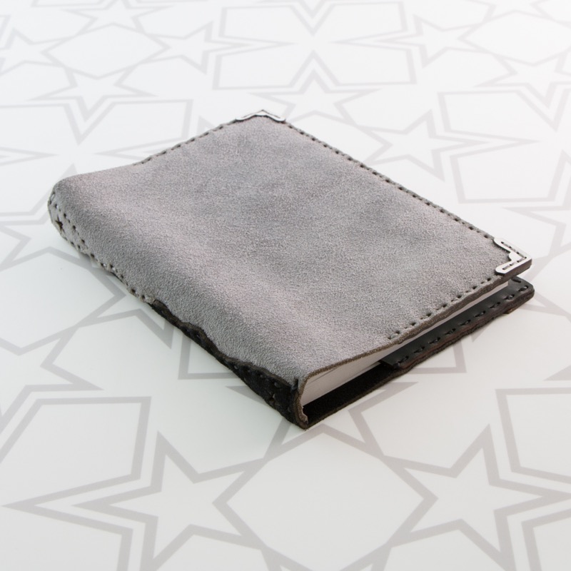 なめらかで手触りの良いスエードを使用したブックカバーです。背表紙の部分で波型に切り返しが入ったツートンカラーで手帳や本を彩ります。小さなふたつの星がワンポイントになったシンプルで使いやすいデザインです。A6判の文庫本サイズ以外にも、新書判サイズ、B6判、A5判、B5判、全5種類の豊富なサイズをご用意しております。※画像3枚目は装着イメージです。