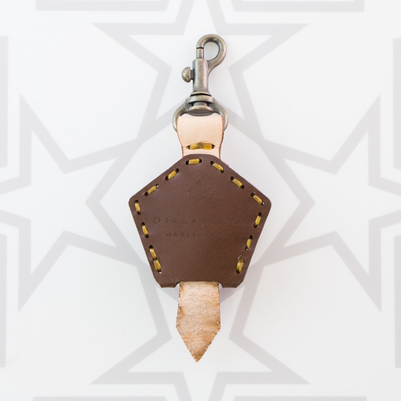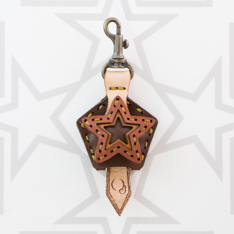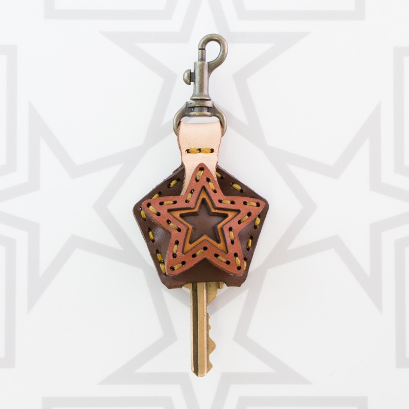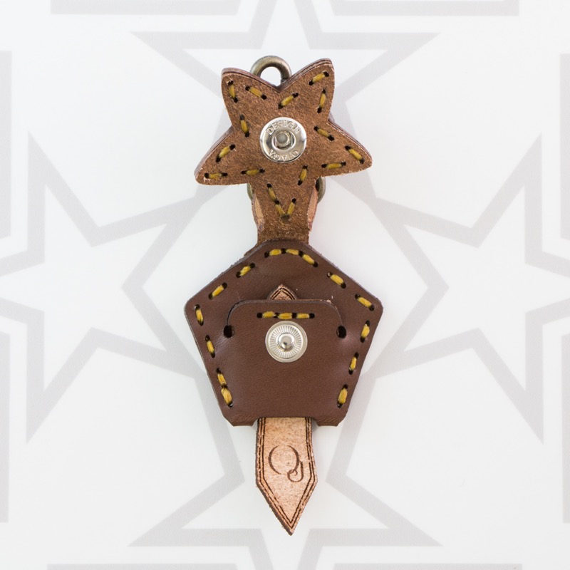五芒星がデザインされたキーキャップです。ベースの五角形の上に3枚の革の五芒星を組み合わせた、立体感のある仕上がりです。お手持ちの鍵をおしゃれに彩るだけでなく鍵の目印にもなり、便利なナスカン付きなので、ベルトループ、キーホルダー、ファスナーなどに着けて紛失防止にも役立ちます。
