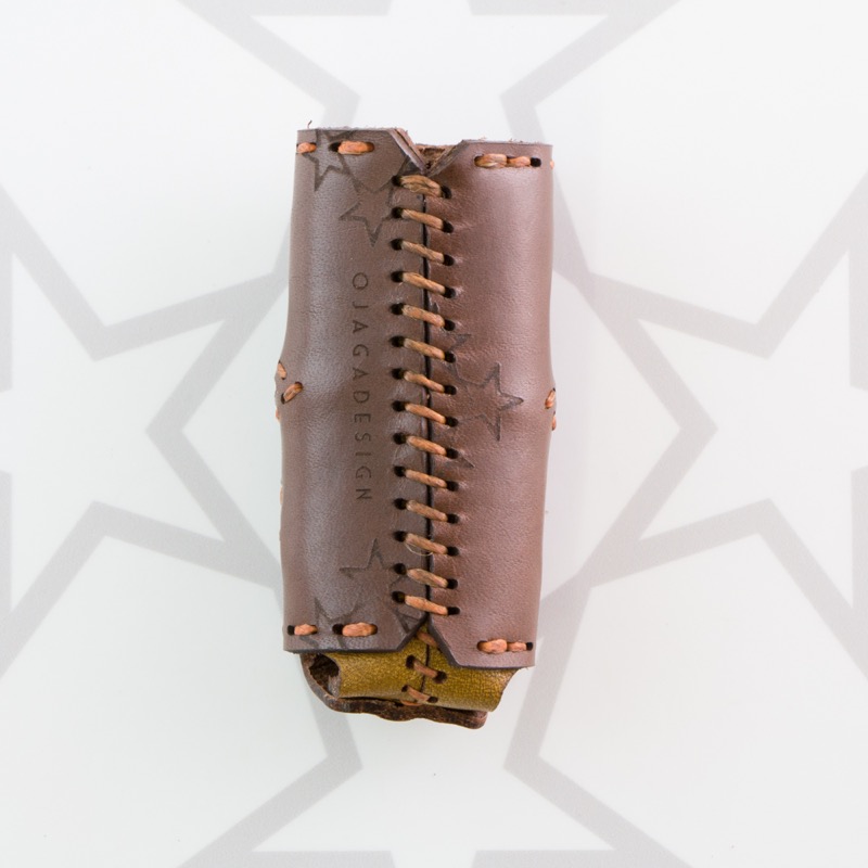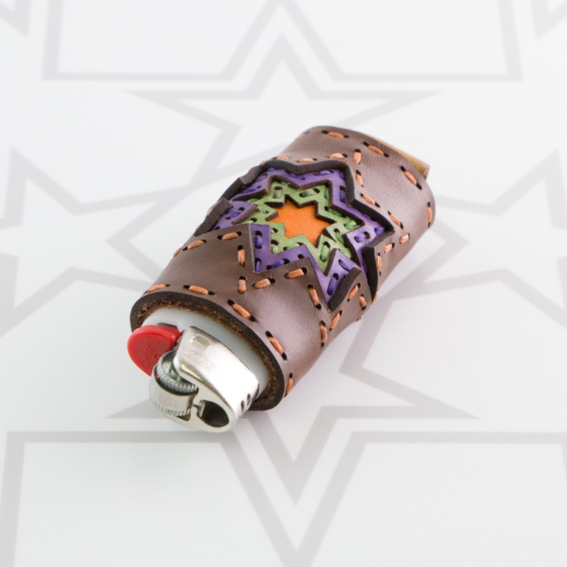 レザーを贅沢に4枚重ね、八芒星を表現したライターケースです。繊細なレザーのカッティングと細かなステッチで、高級感のある仕上がりとなりました。BICのライターがぴったり入るサイズです。