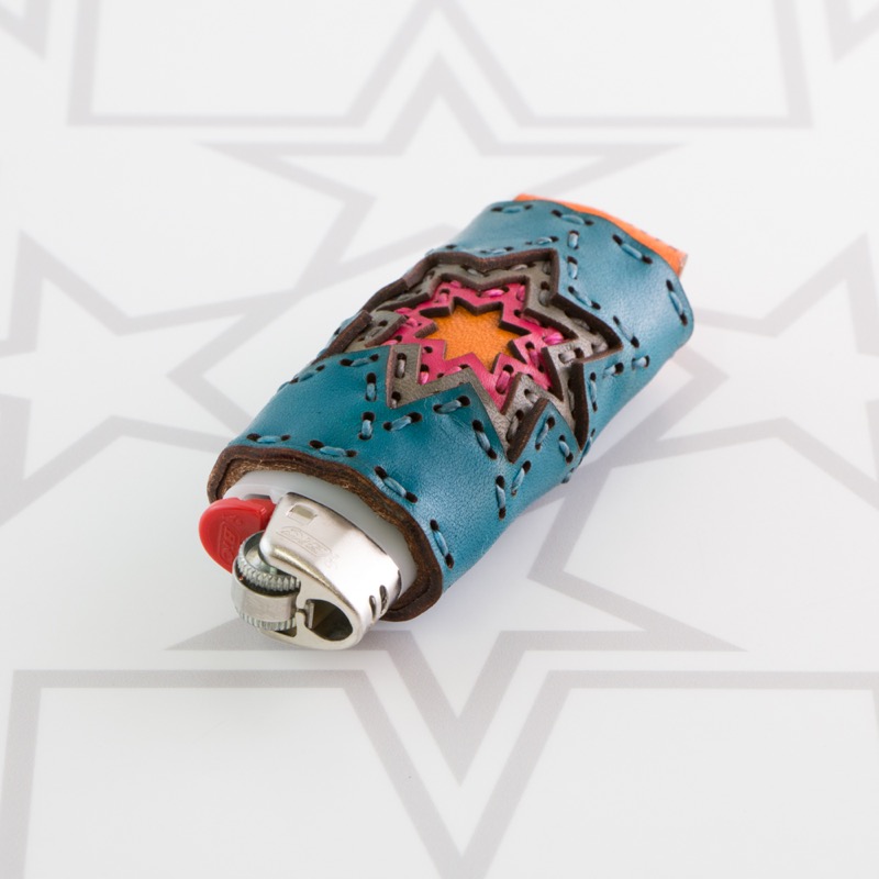 レザーを贅沢に4枚重ね、八芒星を表現したライターケースです。繊細なレザーのカッティングと細かなステッチで、高級感のある仕上がりとなりました。BICのライターがぴったり入るサイズです。