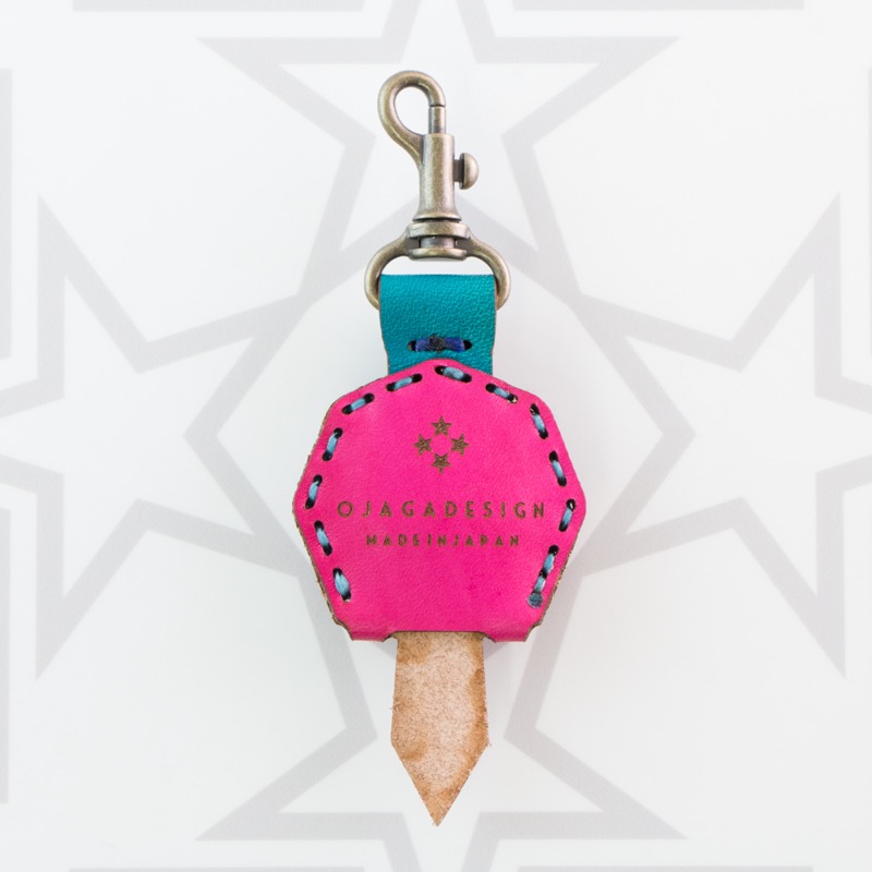八芒星がデザインされたキーキャップです。三枚の革を重ねて表現した八芒星が印象的な仕上がりとなりました。お手持ちの鍵をおしゃれに彩るだけでなく鍵の目印にもなり、便利なナスカン付きなので、ベルトループ、キーホルダー、ファスナーなどに着けて紛失防止にも役立ちます。