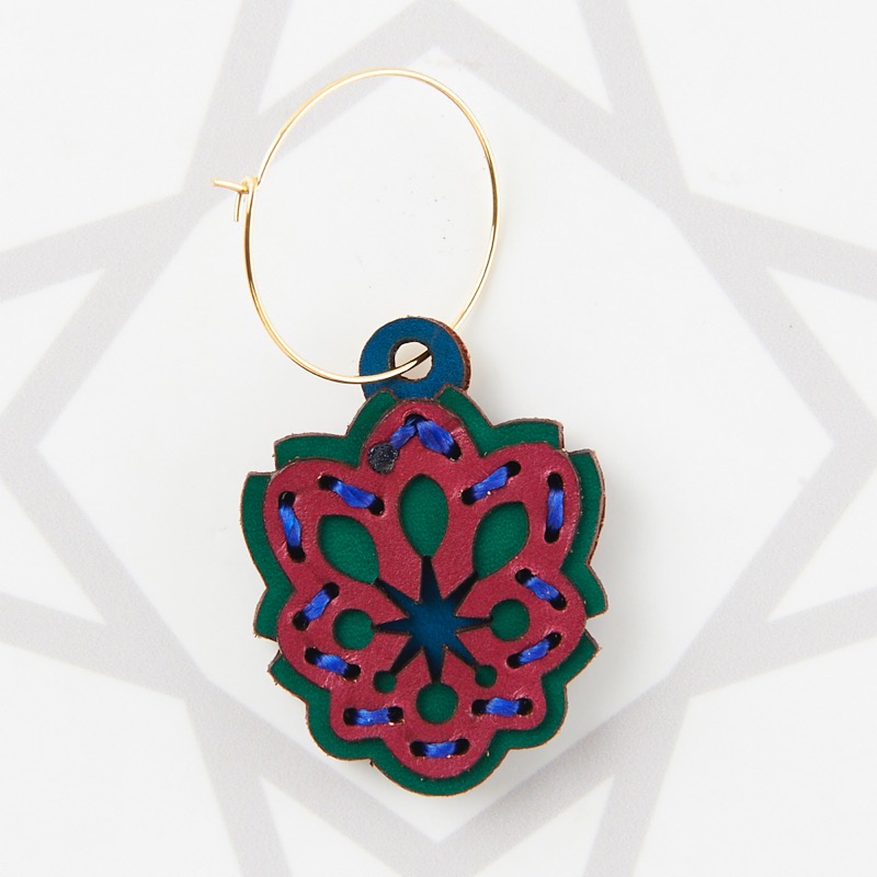 新デザインのフープピアスです。幾何学模様やフォークロア柄をイメージさせる独特なモチーフをアイコンにし、さりげないパンチングが目を惹くデザインです。華奢でシンプルな細い線のフープピアスを使用しているのでモチーフが目立ち、細いフープと個性的なモチーフが絶妙なバランスに仕上がりました。表裏それぞれ異なったカラーリングなので、リバーシブルでお楽しみ頂けます。片耳用なので、左右違ったデザインでのコーディネートもおすすめです。
