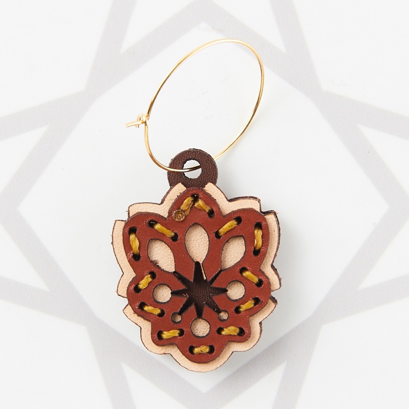 新デザインのフープピアスです。幾何学模様やフォークロア柄をイメージさせる独特なモチーフをアイコンにし、さりげないパンチングが目を惹くデザインです。華奢でシンプルな細い線のフープピアスを使用しているのでモチーフが目立ち、細いフープと個性的なモチーフが絶妙なバランスに仕上がりました。表裏それぞれ異なったカラーリングなので、リバーシブルでお楽しみ頂けます。片耳用なので、左右違ったデザインでのコーディネートもおすすめです。