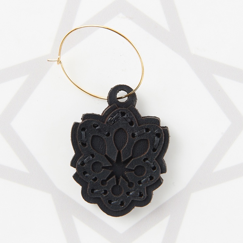 新デザインのフープピアスです。幾何学模様やフォークロア柄をイメージさせる独特なモチーフをアイコンにし、さりげないパンチングが目を惹くデザインです。華奢でシンプルな細い線のフープピアスを使用しているのでモチーフが目立ち、細いフープと個性的なモチーフが絶妙なバランスに仕上がりました。表裏それぞれ異なったカラーリングなので、リバーシブルでお楽しみ頂けます。片耳用なので、左右違ったデザインでのコーディネートもおすすめです。