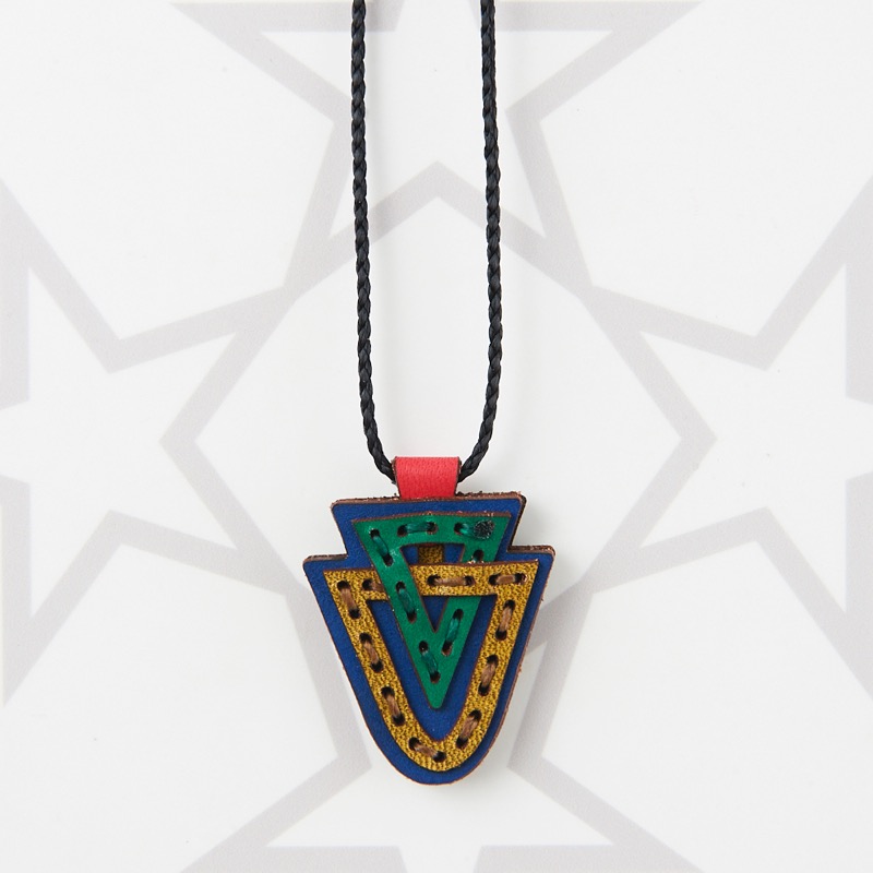 新デザインのネックレスです。幾何学模様やフォークロア柄をイメージさせる独特なモチーフをアイコンにし、編み込みのような革の重なりと星のくり抜きが目を惹くデザインです。表裏それぞれ異なったカラーリングなので、リバーシブルでお楽しみ頂けます。紐部分のレザービーズで紐をお好みの長さに調整出来る仕様となっております。