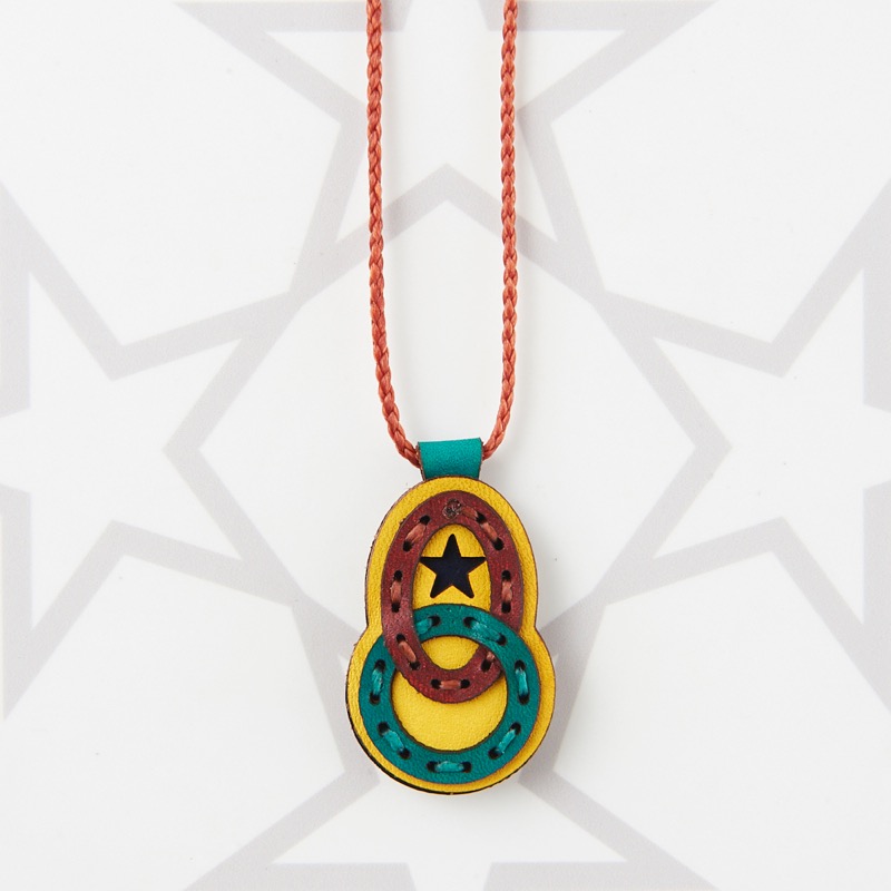 新デザインのネックレスです。幾何学模様やフォークロア柄をイメージさせる独特なモチーフをアイコンにし、編み込みのような革の重なりと星のくり抜きが目を惹くデザインです。表裏それぞれ異なったカラーリングなので、リバーシブルでお楽しみ頂けます。紐部分のレザービーズで紐をお好みの長さに調整出来る仕様となっております。