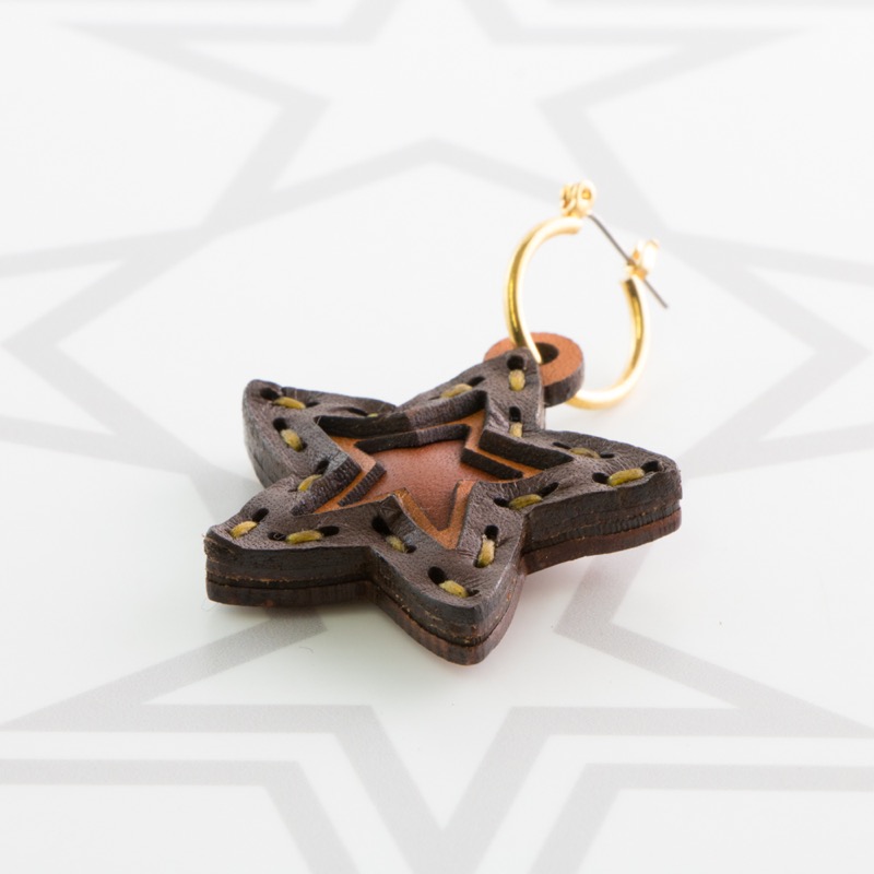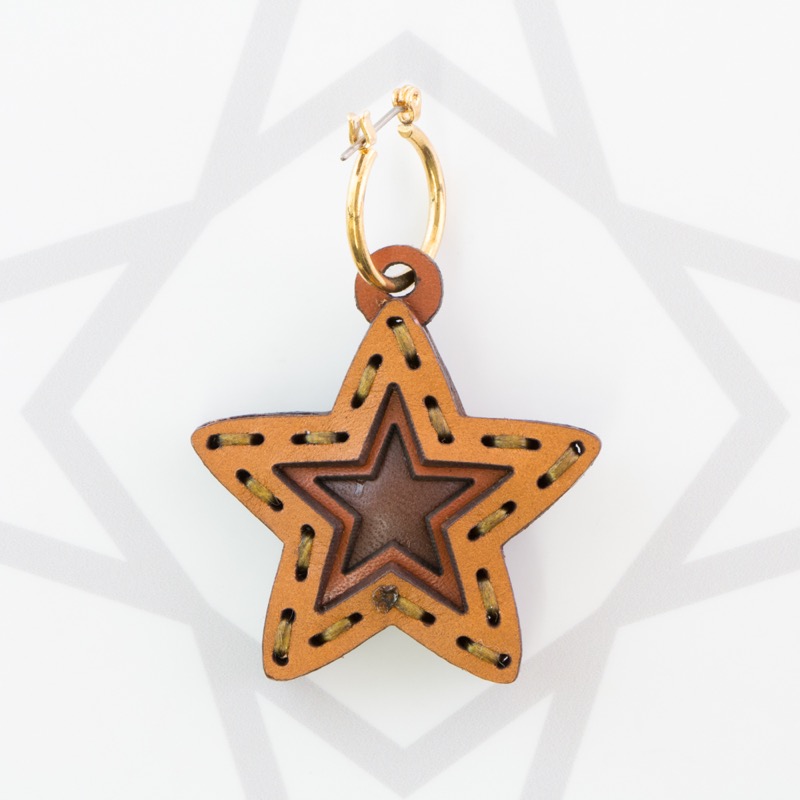 五芒星型の片耳用ピアスです。三枚の革を重ねた存在感のある仕上がりは、ファッションのアクセントに最適です。表裏それぞれ異なったカラーリングなので、リバーシブルでお楽しみ頂けます。片耳用なので、左右違ったデザインでのコーディネートもおすすめです。