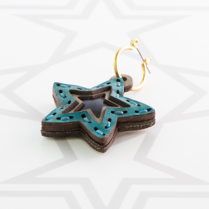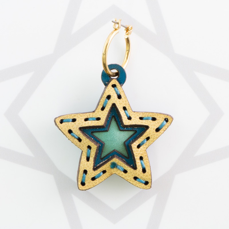 五芒星型の片耳用ピアスです。三枚の革を重ねた存在感のある仕上がりは、ファッションのアクセントに最適です。表裏それぞれ異なったカラーリングなので、リバーシブルでお楽しみ頂けます。片耳用なので、左右違ったデザインでのコーディネートもおすすめです。