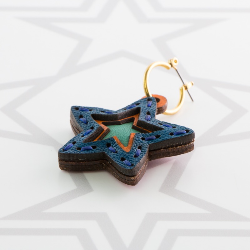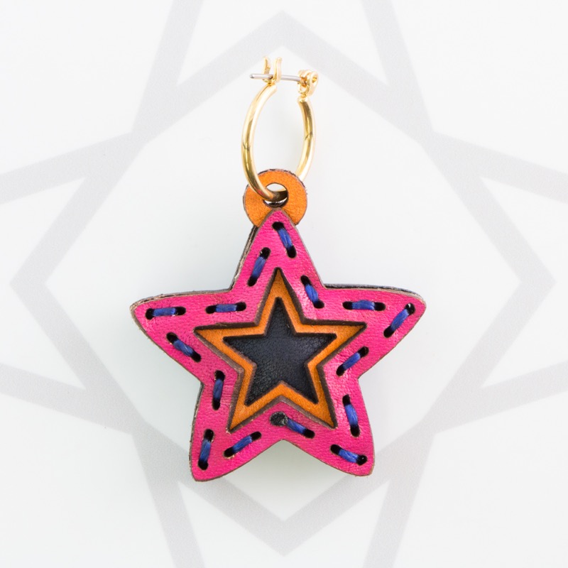 五芒星型の片耳用ピアスです。三枚の革を重ねた存在感のある仕上がりは、ファッションのアクセントに最適です。表裏それぞれ異なったカラーリングなので、リバーシブルでお楽しみ頂けます。片耳用なので、左右違ったデザインでのコーディネートもおすすめです。
