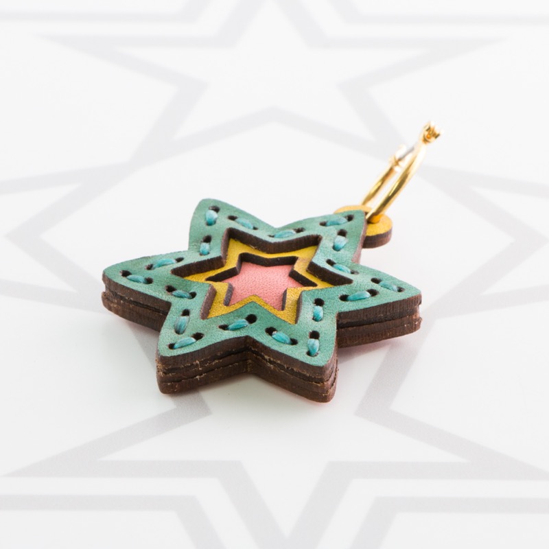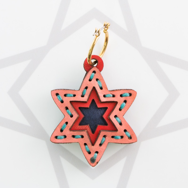 六芒星型の片耳用ピアスです。三枚の革を重ねた存在感のある仕上がりは、ファッションのアクセントに最適です。表裏それぞれ異なったカラーリングなので、リバーシブルでお楽しみ頂けます。片耳用なので、左右違ったデザインでのコーディネートもおすすめです。