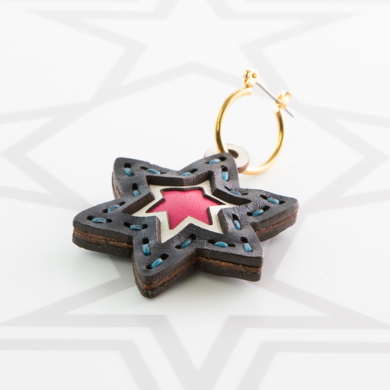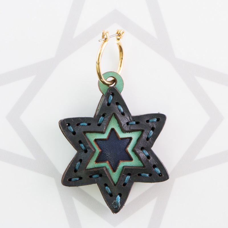 六芒星型の片耳用ピアスです。三枚の革を重ねた存在感のある仕上がりは、ファッションのアクセントに最適です。表裏それぞれ異なったカラーリングなので、リバーシブルでお楽しみ頂けます。片耳用なので、左右違ったデザインでのコーディネートもおすすめです。