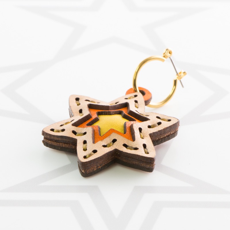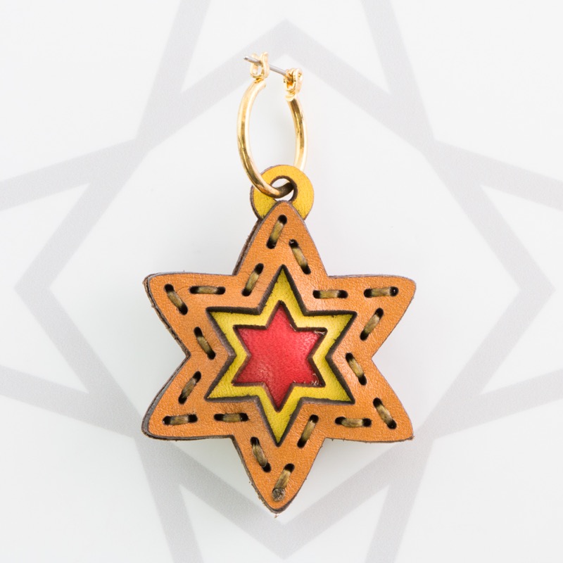 六芒星型の片耳用ピアスです。三枚の革を重ねた存在感のある仕上がりは、ファッションのアクセントに最適です。表裏それぞれ異なったカラーリングなので、リバーシブルでお楽しみ頂けます。片耳用なので、左右違ったデザインでのコーディネートもおすすめです。