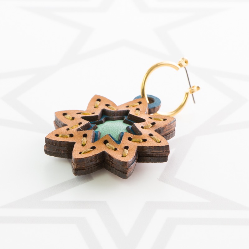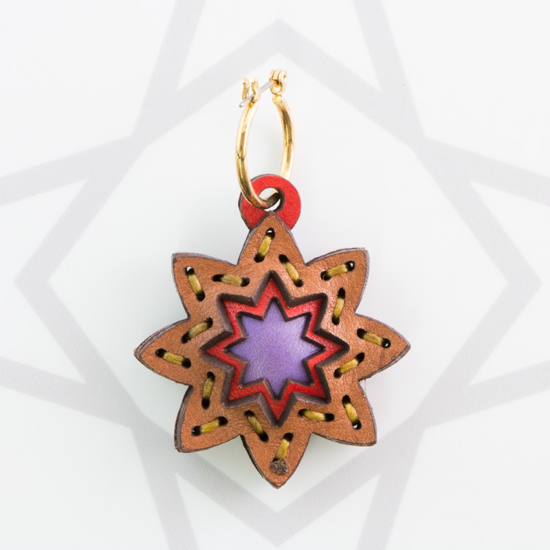 八芒星型の片耳用ピアスです。三枚の革を重ねた存在感のある仕上がりは、ファッションのアクセントに最適です。表裏それぞれ異なったカラーリングなので、リバーシブルでお楽しみ頂けます。片耳用なので、左右違ったデザインでのコーディネートもおすすめです。