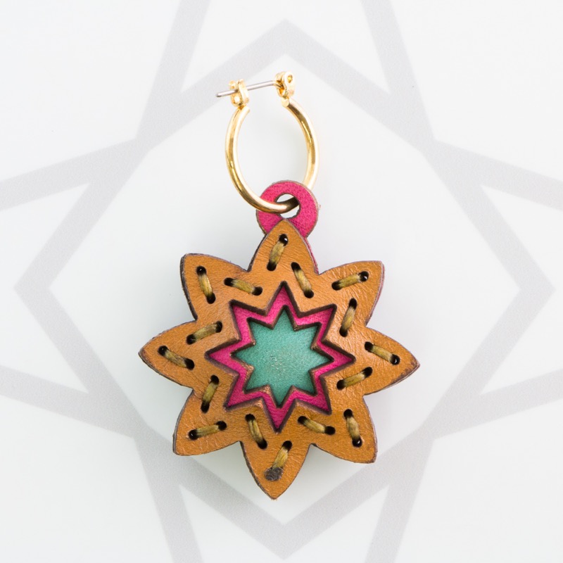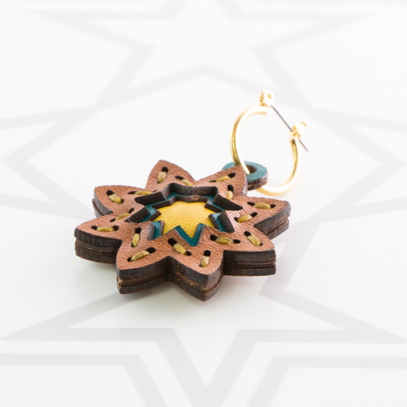 八芒星型の片耳用ピアスです。三枚の革を重ねた存在感のある仕上がりは、ファッションのアクセントに最適です。表裏それぞれ異なったカラーリングなので、リバーシブルでお楽しみ頂けます。片耳用なので、左右違ったデザインでのコーディネートもおすすめです。