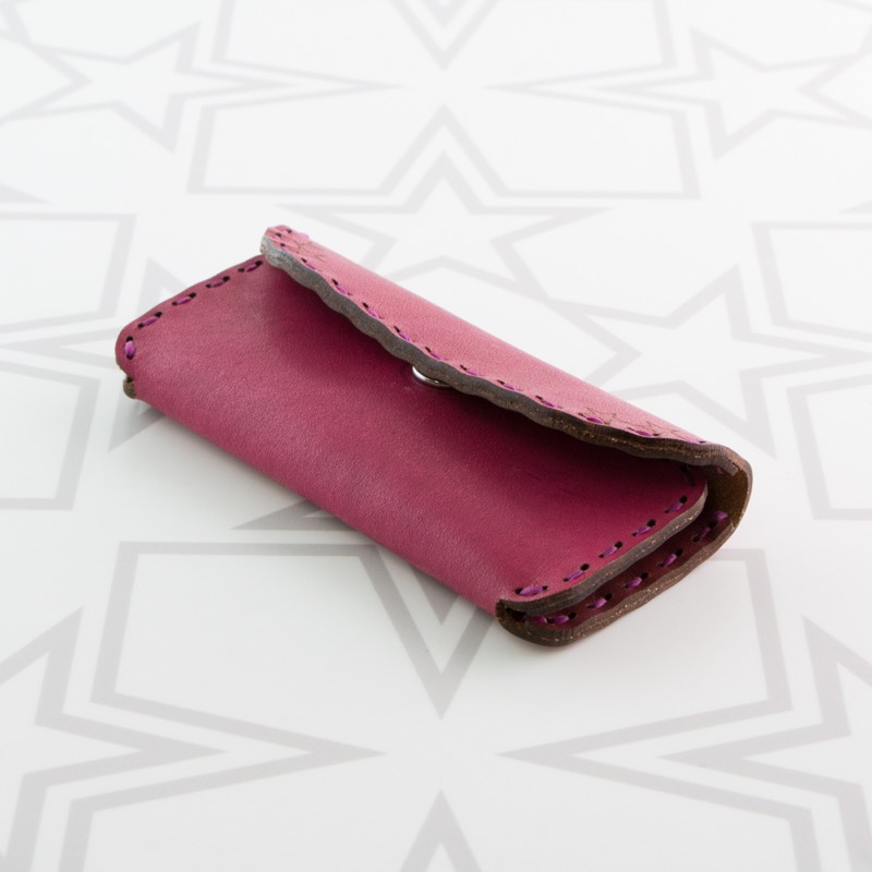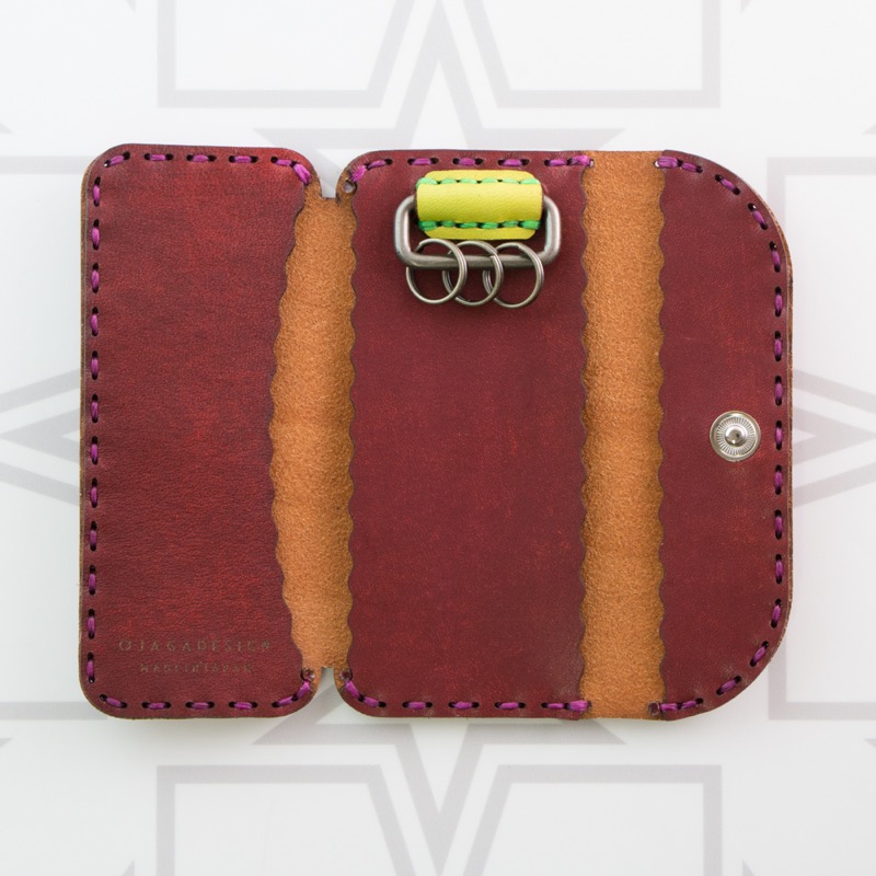シンプルなデザインを施したキーケースです。レザーの色をお楽しみいただけるよう、シンプルに焼印のみを施し、ポケットにも入るすっきりとしたフォルムに仕上がりました。中には二重リングが3つ付いており、複数の鍵が着けられます。