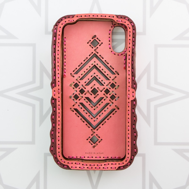 iPhoneX用のケースです。幾何学模様のレザーパーツが幾重にもなった繊細なデザインで、iPhone本体が透けるくり抜きを施したさりげない遊び心がポイント。iPhoneの側面をすべてレザーで覆った保護性の高いアイテムです。※画像4枚目は着用イメージです。※お使いの充電器によってはワイヤレス充電機能がお使いいただけない場合がございます。予めご了承下さい。