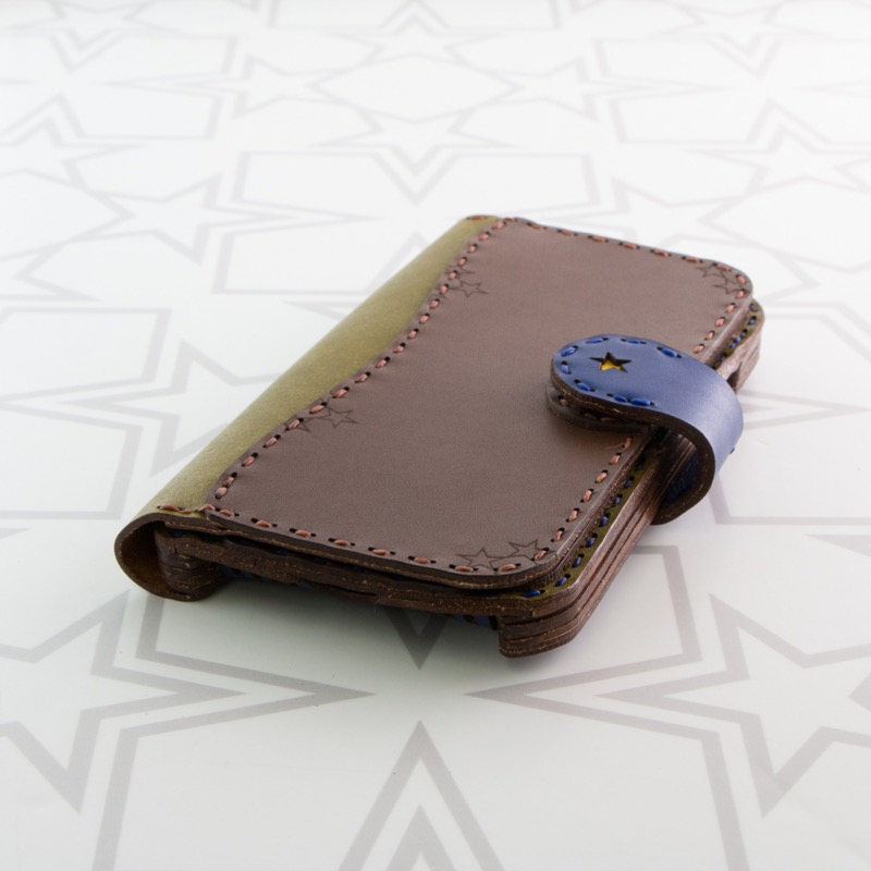 表にレザーの切り返しが入り、星でくり抜かれたベルトが付いた、シンプルで使いやすいデザインに仕上がりました。