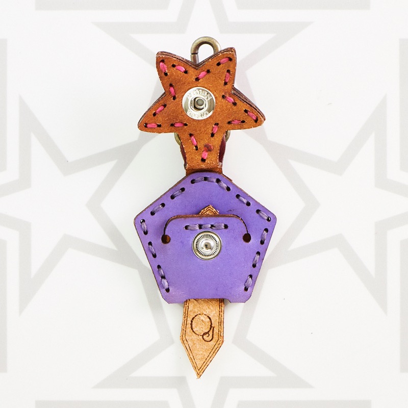 五芒星がデザインされたキーキャップです。ベースの五角形の上に3枚の革の五芒星を組み合わせた、立体感のある仕上がりです。お手持ちの鍵をおしゃれに彩るだけでなく鍵の目印にもなり、便利なナスカン付きなので、ベルトループ、キーホルダー、ファスナーなどに着けて紛失防止にも役立ちます。