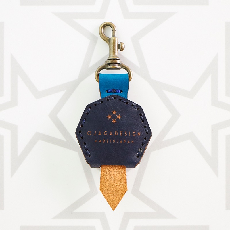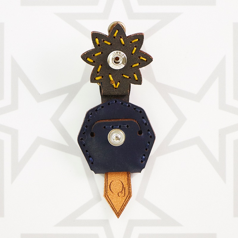 八芒星がデザインされたキーキャップです。三枚の革を重ねて表現した八芒星が印象的な仕上がりとなりました。お手持ちの鍵をおしゃれに彩るだけでなく鍵の目印にもなり、便利なナスカン付きなので、ベルトループ、キーホルダー、ファスナーなどに着けて紛失防止にも役立ちます。