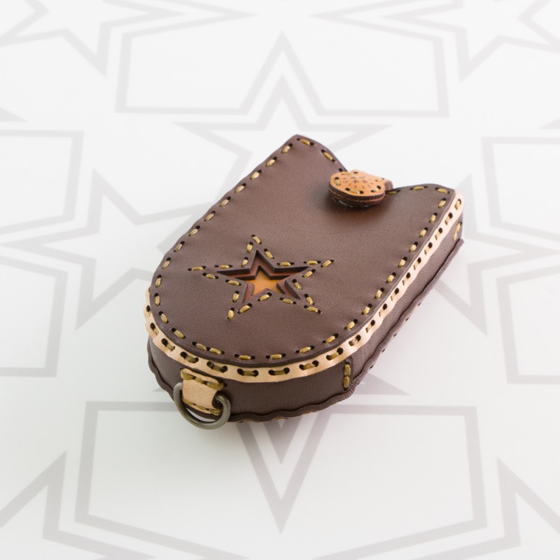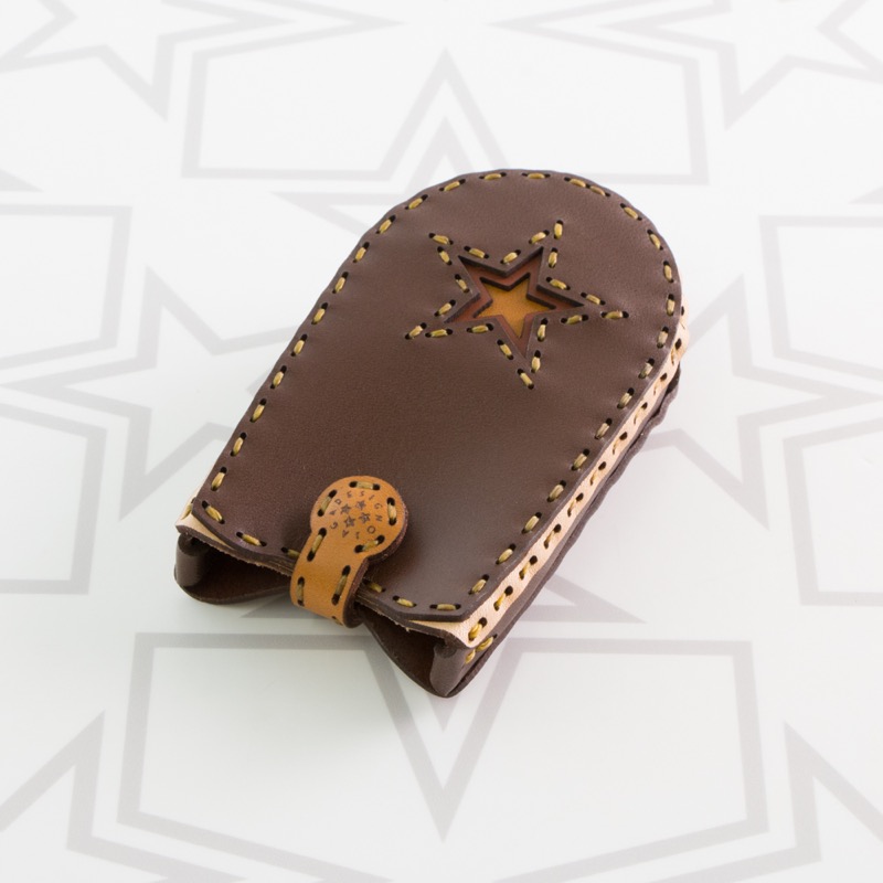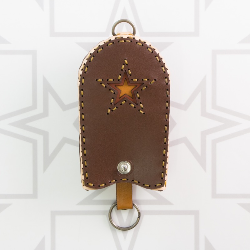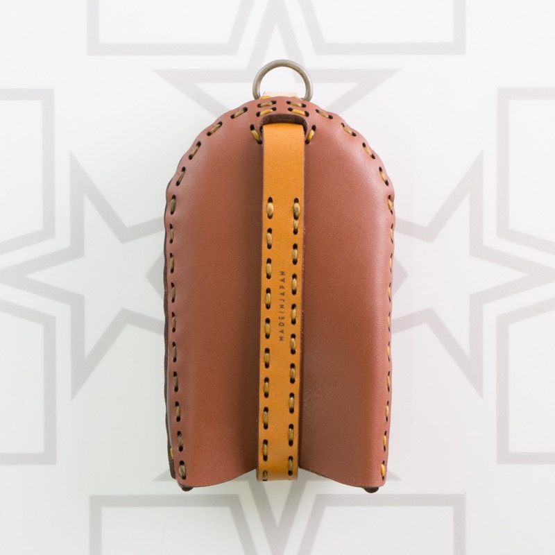 新アイテムのキーケースです。スナップボタンを外すとベルトが下がってくる仕組みになっており、ベルトの先の二重リングに鍵を付けて、鍵を引き出して使うベル型です。ケースに厚みがあるので複数の鍵、スマートキーやセンサーキーなども着けられます。大きな五芒星がポイントになったオジャガデザインらしいアイテムです。