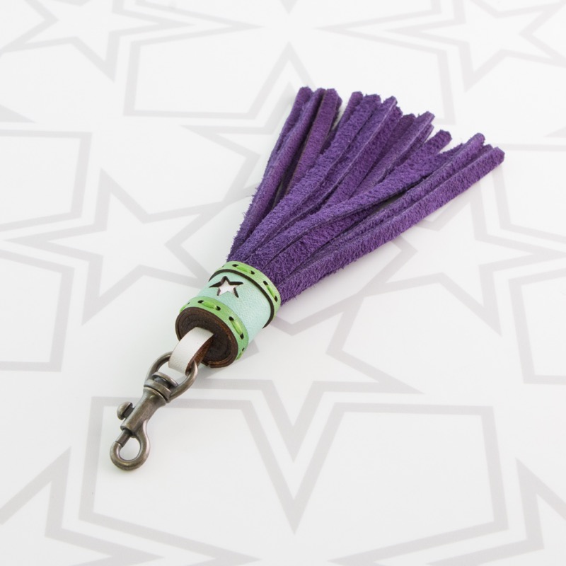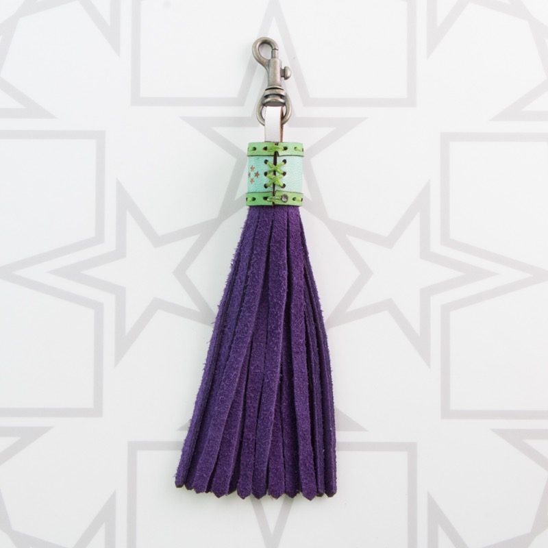 スエードを使用したタッセルチャームです。小さな星がワンポイントになった、スエードのフリンジが揺れるタッセルです。ファッションのアクセントになる大きめのサイズ感で、シンプルなアイテムにぴったり。ファスナートップやキーホルダー、Dカンなどに着けられるナスカンタイプと、トートバッグなどのハンドル部分に最適なベルトタイプの2種類をご用意しており、こちらはナスカンタイプ。カラーも豊富に取り揃えているので、お手持ちのアイテムに合わせてコーディネートをお楽しみ下さい。