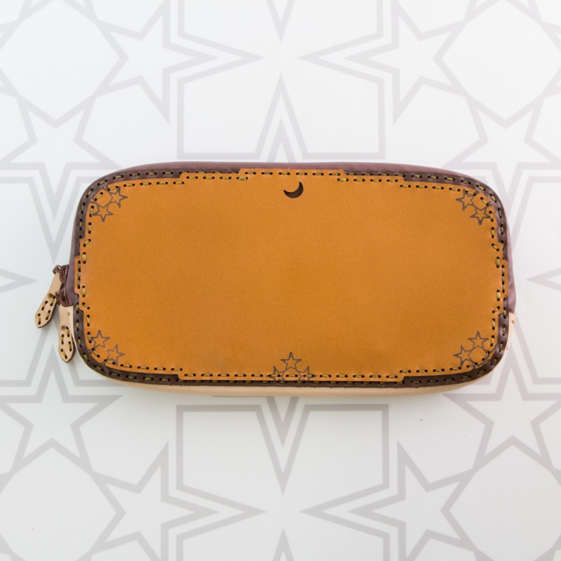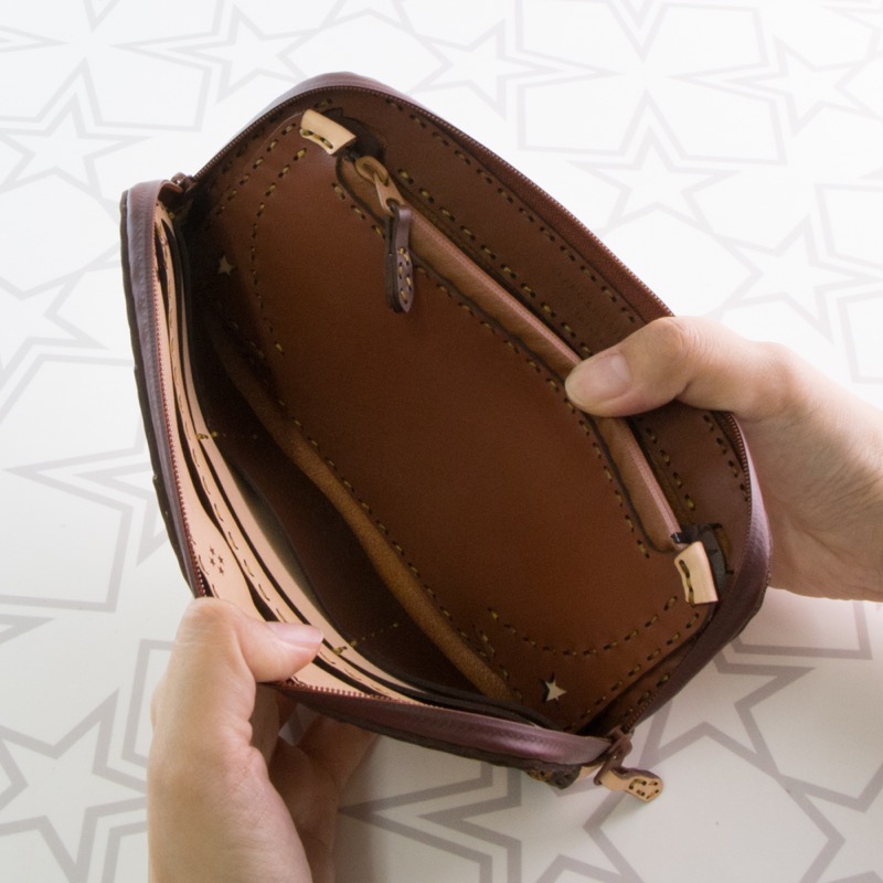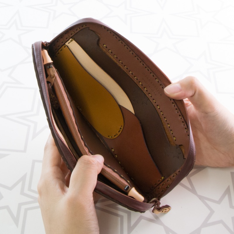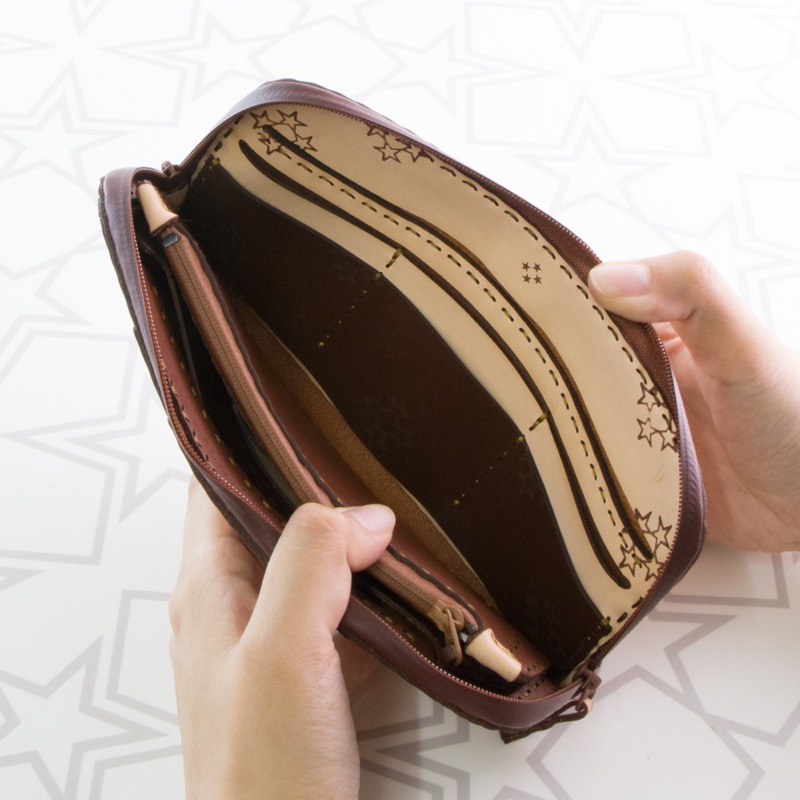 丸みを帯びた折り重なるポケットや弧を描くカット、コインケースに隠れた五芒星など、中のデザインにも遊び心を取り入れたオジャガデザインらしい仕上がりです。