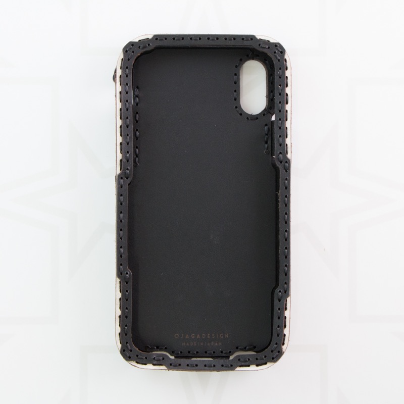 シンプルなデザインのiPhone X / XSケースです。ポケット付きのケースにOJAGA STARをデザインしました。サイドのマチ部分にもさりげなくデザインが入りました。マチまでレザーで仕上げることで保護性が高くなるだけでなく、長く使うことで手にしっくりと馴染みます。※お使いの充電器によってはワイヤレス充電機能がお使いいただけない場合がございます。予めご了承下さい。