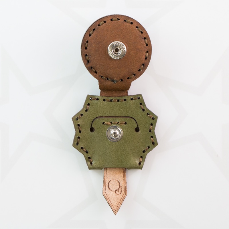 丸いフラップ部分とは対照的なギザギザした背面が特徴です。