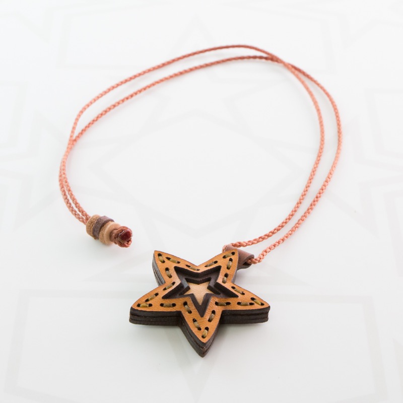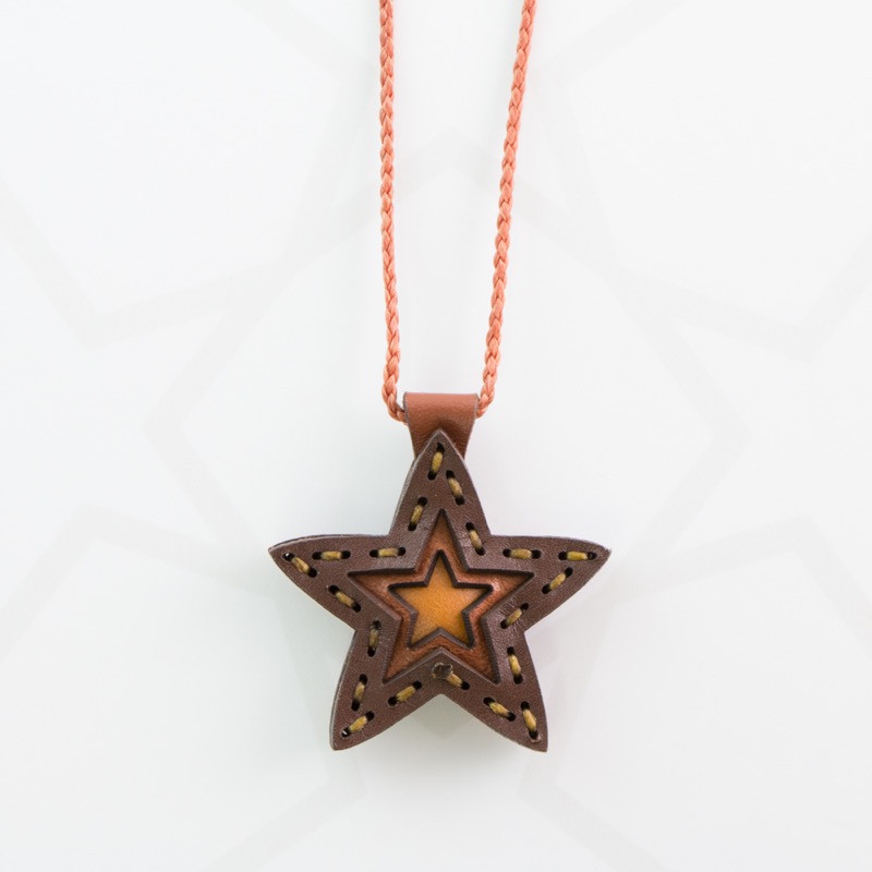 五芒星をデザインしたネックレスです。三枚の革を重ねた存在感のある仕上がりは、ファッションのアクセントに最適です。表裏それぞれ異なったカラーリングなので、リバーシブルでお楽しみ頂けます。紐部分のレザービーズで紐をお好みの長さに調整出来る仕様となっております。