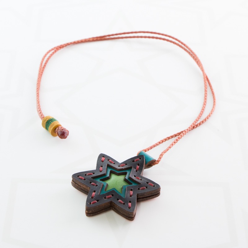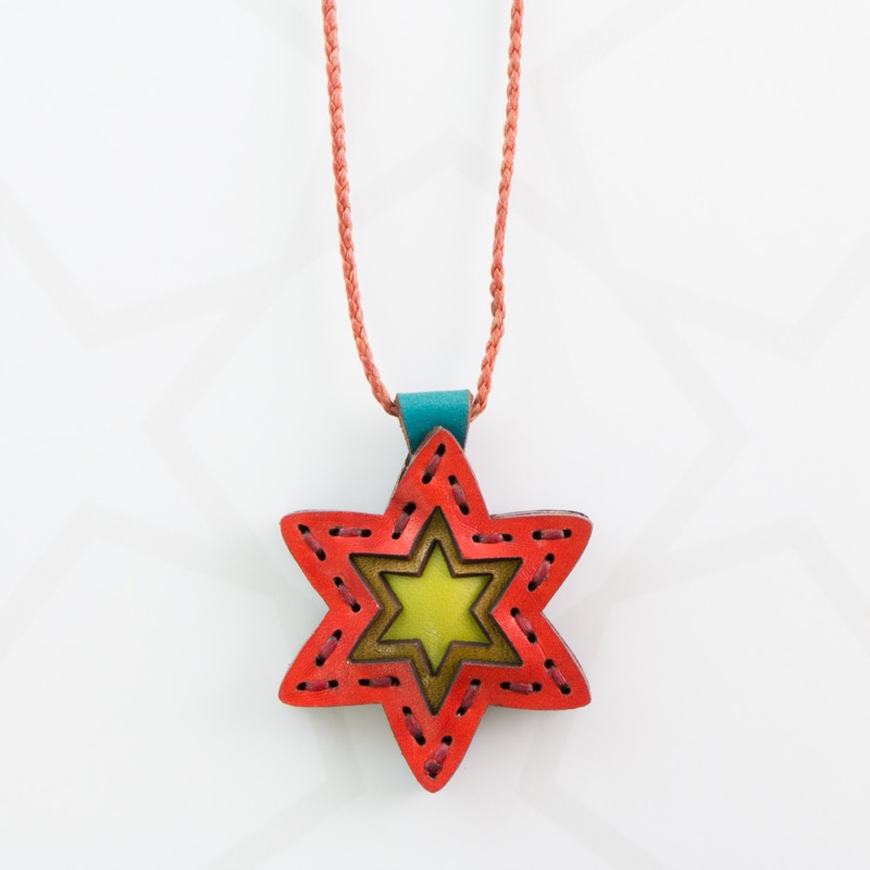 六芒星をデザインしたネックレスです。三枚の革を重ねた存在感のある仕上がりは、ファッションのアクセントに最適です。表裏それぞれ異なったカラーリングなので、リバーシブルでお楽しみ頂けます。紐部分のレザービーズで紐をお好みの長さに調整出来る仕様となっております。