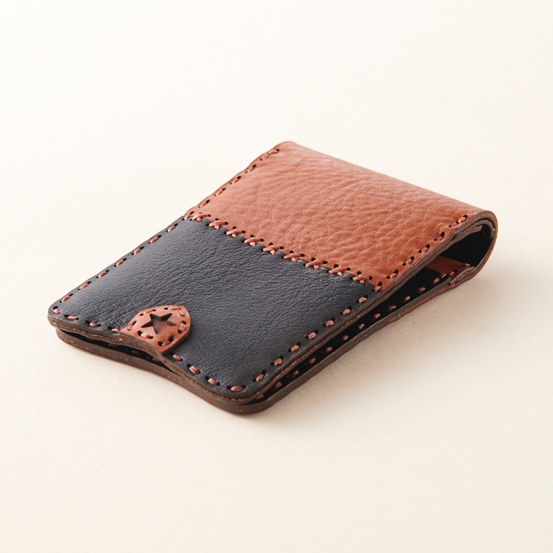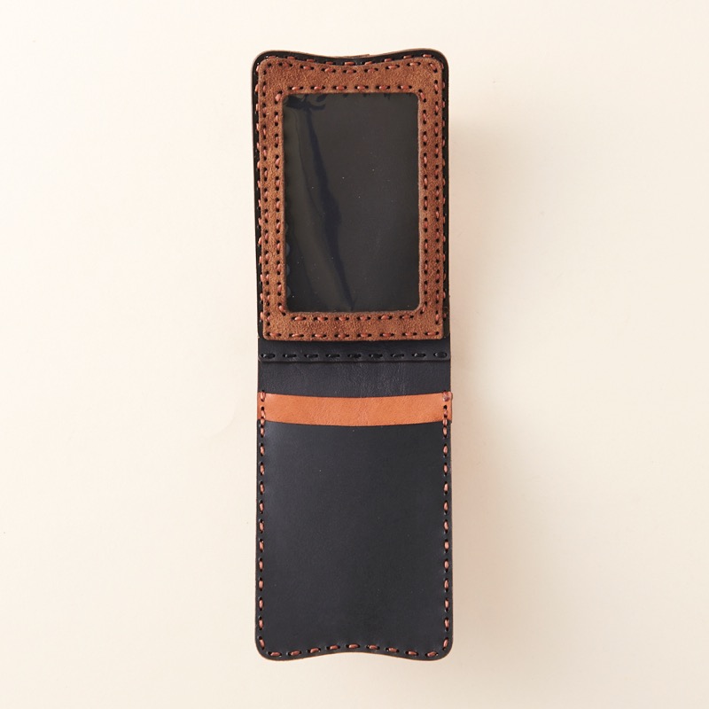シンプルでツートーンカラーのアクセントが魅力の折りたたみタイプのパスケース。窓付きのカードケースとポケットが二箇所付いており、透明窓の部分には免許書、社員証、写真などを入れるのを便利です。手のひらに収まる小さなサイズながら、大きく開き、両サイドに配置されたカード入れが見やすくて使い勝手の良い仕様なっております。シンプルで飽きのこないデザインなので、長くご愛用いただけます。