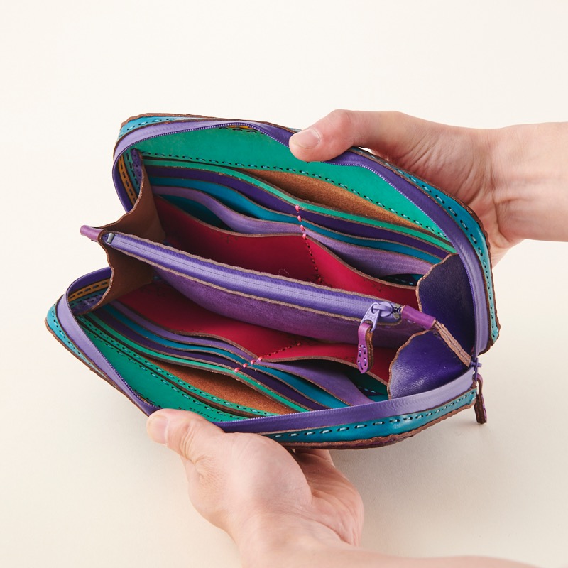 大きく開くダブルジップで中が見やすく、カードポケットが16箇所、ポケットが3箇所、コインケースはたっぷり入るジップタイプ、表にもジップのポケットが付いて収納力抜群の仕上がりになりました。