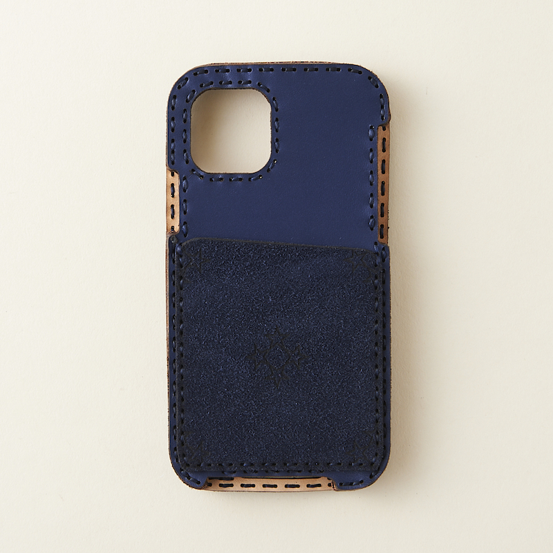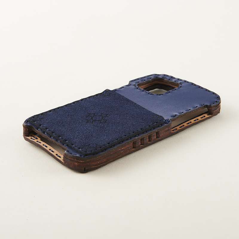 背面を一枚の革で仕上げ、スエード素材のカードポケットにオジャガスターを配置したシンプルなデザインです。
