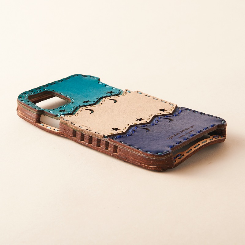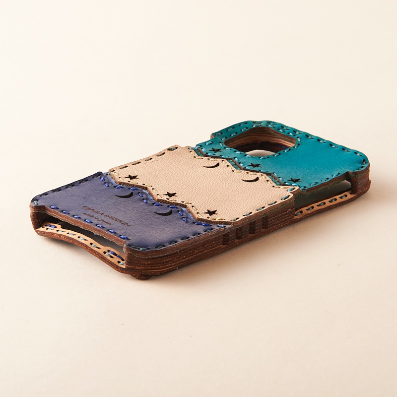ギザギザのパッチワークデザインのiPhone11/11Pro/11ProMax用ケースが登場!ギザギザのパッチワークに月、星のデザインをさりげなく抜いた個性豊かなアイテムに仕上がりました。マチまでレザーで仕上げることで保護性が高くなるだけでなく、長く使うことで手にしっくりと馴染みます。※お使いの充電器によってはワイヤレス充電機能がお使いいただけない場合がございます。予めご了承下さい。
